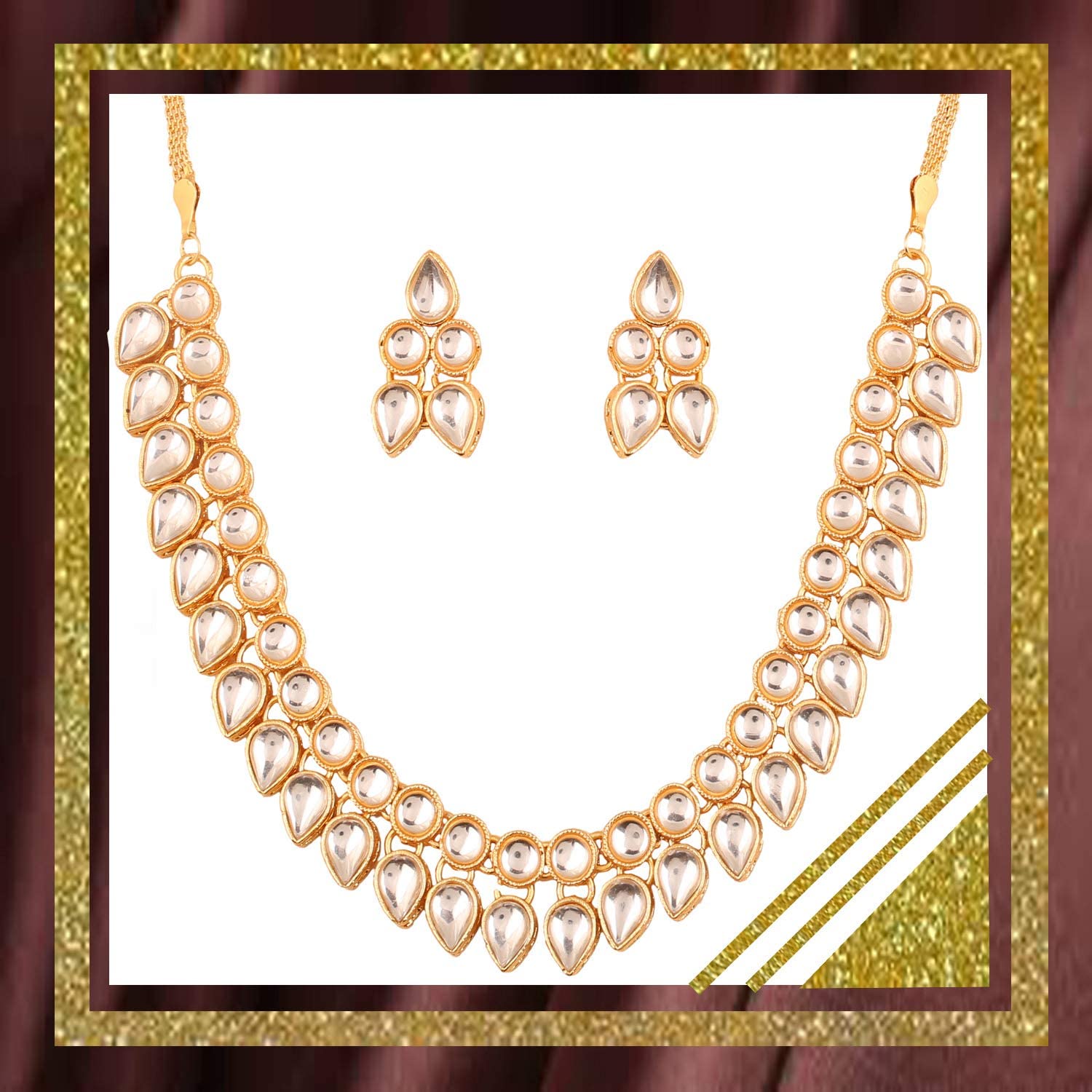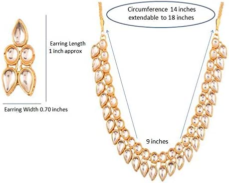 • Touchstone "Contemporary Kundan Collection" Indian Bollywood traditional Mughal Kundan polki look neutral bridal designer jewelry necklace set for women in gold tone SPECIFICATIONS : Necklace 9 inches with extendable flat chain/links up to 18 inches. Earring weight (single) 6 gms. Earrings length 1 inch. Earring width 0.70 inch.