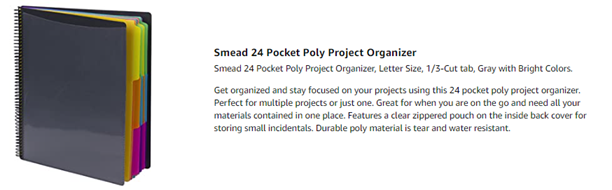 Organize important project documents and take them on the go! Smead’s Poly Project Organizer keeps documents safe, organized and within reach. Includes one letter size (10” W x 12” H) poly project organizer with 24 pockets. Twelve colorful dividers in yellow, neon orange, neon green, blue, neon pink, and fuschia help you sort project components. Slash pockets hold your papers in place in sequential and color-coded order. This spiral bound notebook-style organizer lays flat for ease of use. Slip a cover sheet into the clear front pocket to customize your organizer, and keep essentials such as pens and notecards in the zippered pocket inside the back cover. Use this project organizer for important documents, payables and educational materials. These acid-free and PVC-free project organizers are suitable for home, office and classroom. Excellent for desktop filing and on-the-go use. Easy to wipe clean. Make work flow easier by managing your projects with this useful tool. • A Rich Heritage of Innovation and Quality. A world-leading provider of solutions for efficient document management, Smead is a woman-owned company well-known for its high quality, environmentally responsible products and innovative organizational systems. For more than a century, Smead has been committed to one purpose: Keeping You Organized!