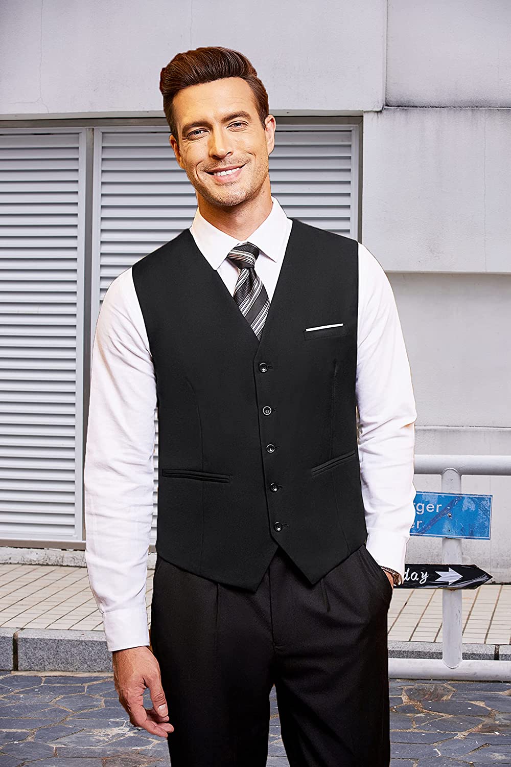 - 【Men's Dress Vest Suit】 The business vest is designed with classic solid color, V-neck, 5-buttons closure, and real pockets on the front and sides.