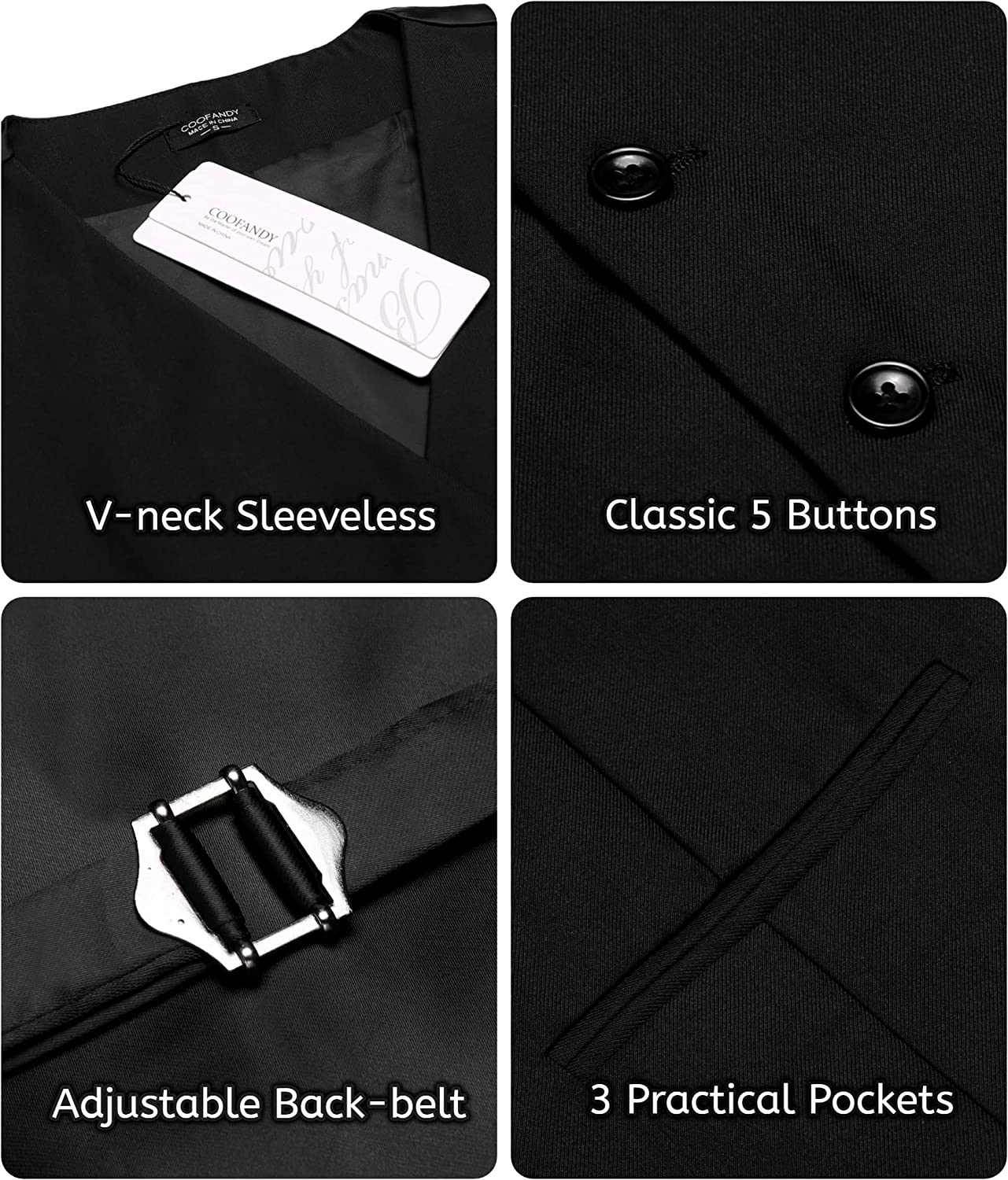 5 buttons, 3 pockets, and adjustable back-belt fashionable suit vest for men is suitable for wedding, work, party, dating, business, workdays,graduation, prom and other formal or casual occasions.Work and Daily Wear for all seasons,perfect gift for father,husband, fiance or boyfriend.