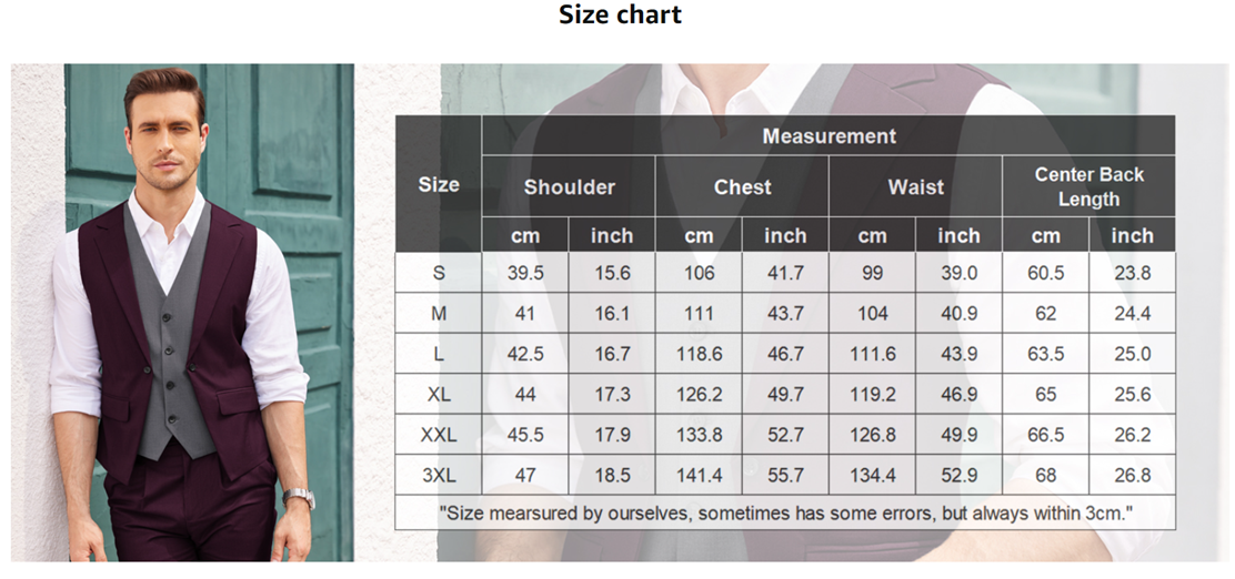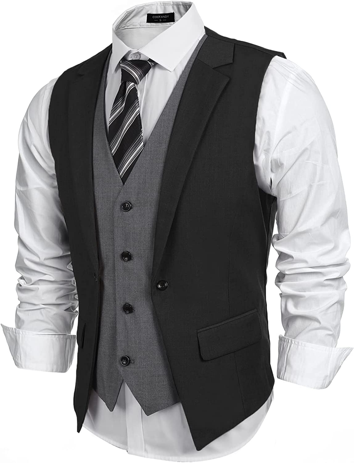 - STYLISH DESIGN - Men's layered dress waistcoat is designed to doulble layer, adjustable back strap, V-neck, sleeveless, 4 buttons, classic single breasted. Easily stands out from usual suit coat yet looks very handsome.