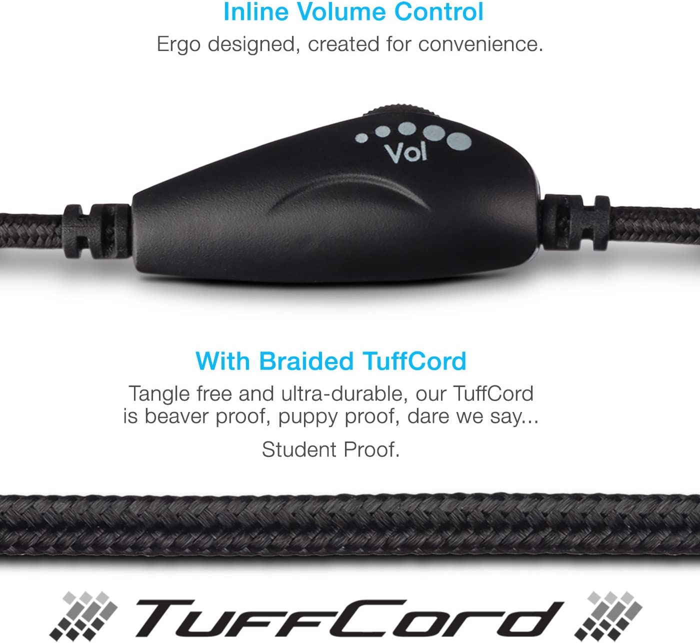 Durable Design: Adjustable headband with easy to clean leatherette earpads. Headset and tangle free braided TuffCord cable are designed for hard wearing and to be long lasting.