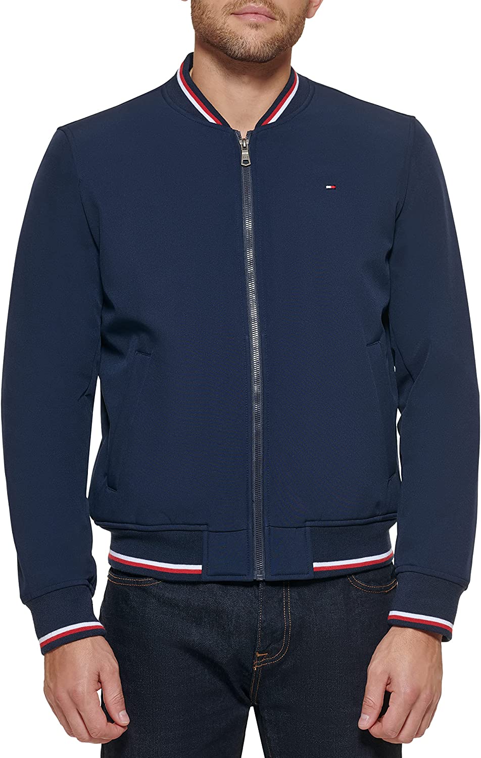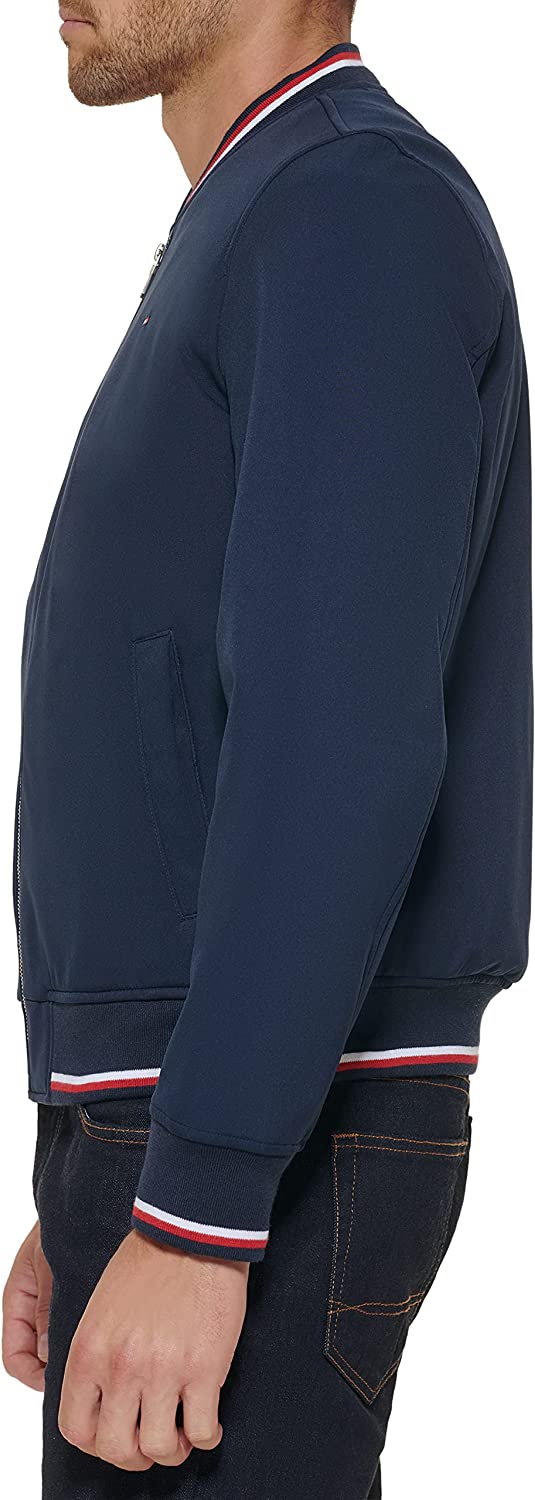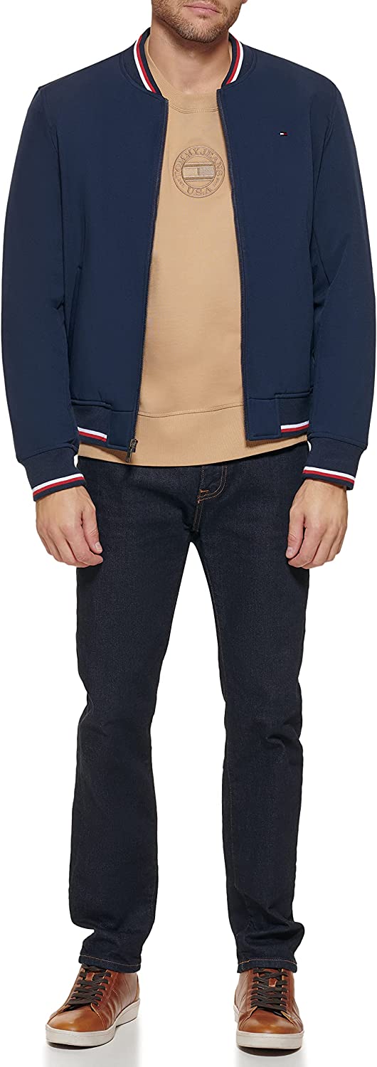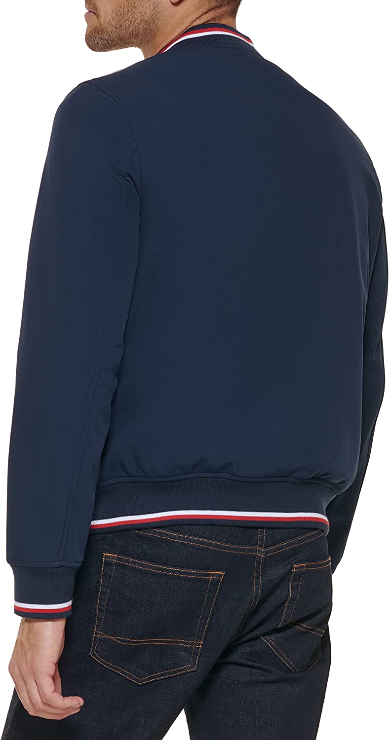 - STYLISH FEATURES: Tri-color contrast rib knit collar, cuffs, and hem; Tommy Hilfiger Signature Flag at left chest; Tommy Hilfiger rubber patch on left sleeve
