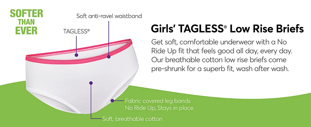 - LOW-RISE FIT – This girls’ underwear style provides the full coverage both front and back you expect from girls’ briefs but hits below the waist so there is no “peeking” above her pants