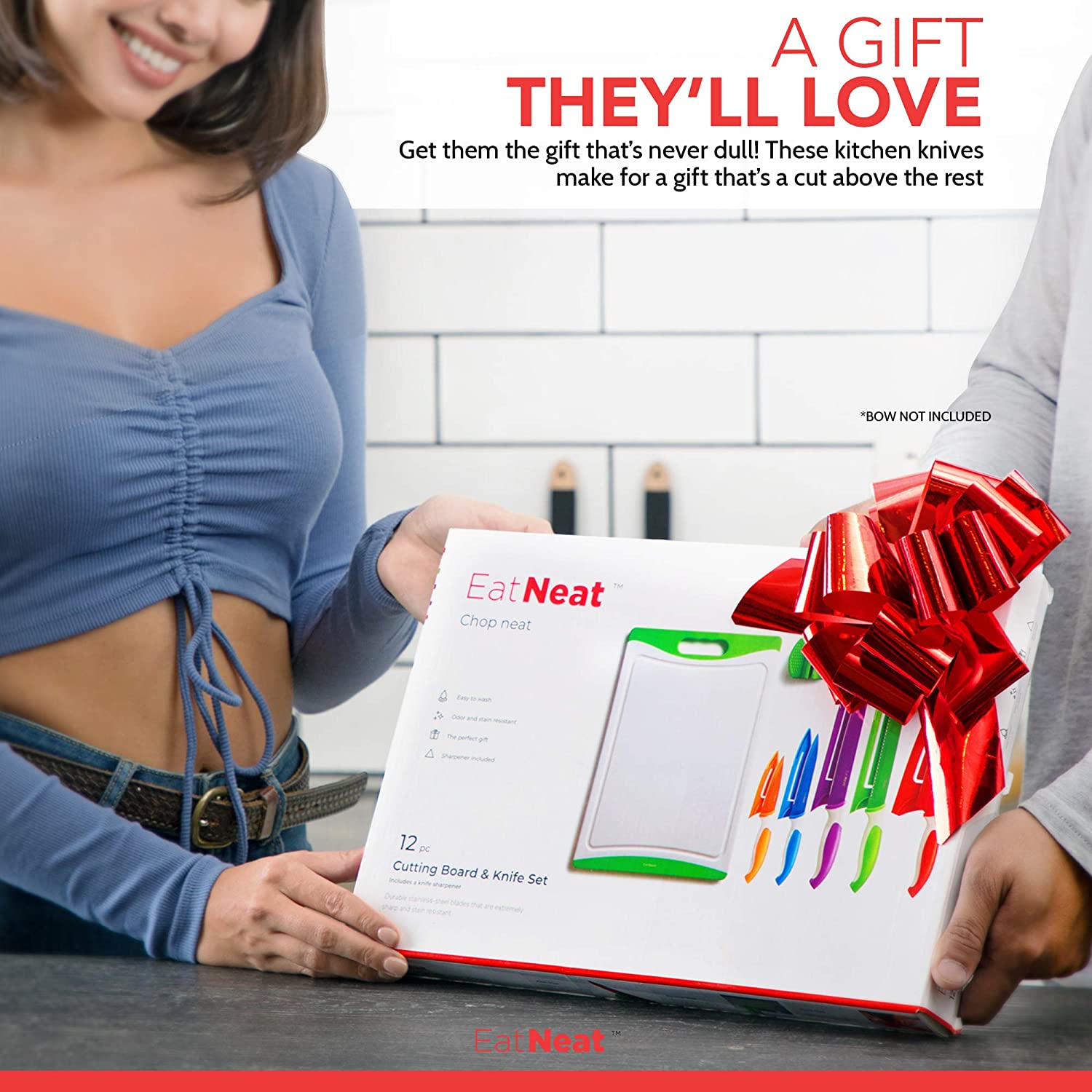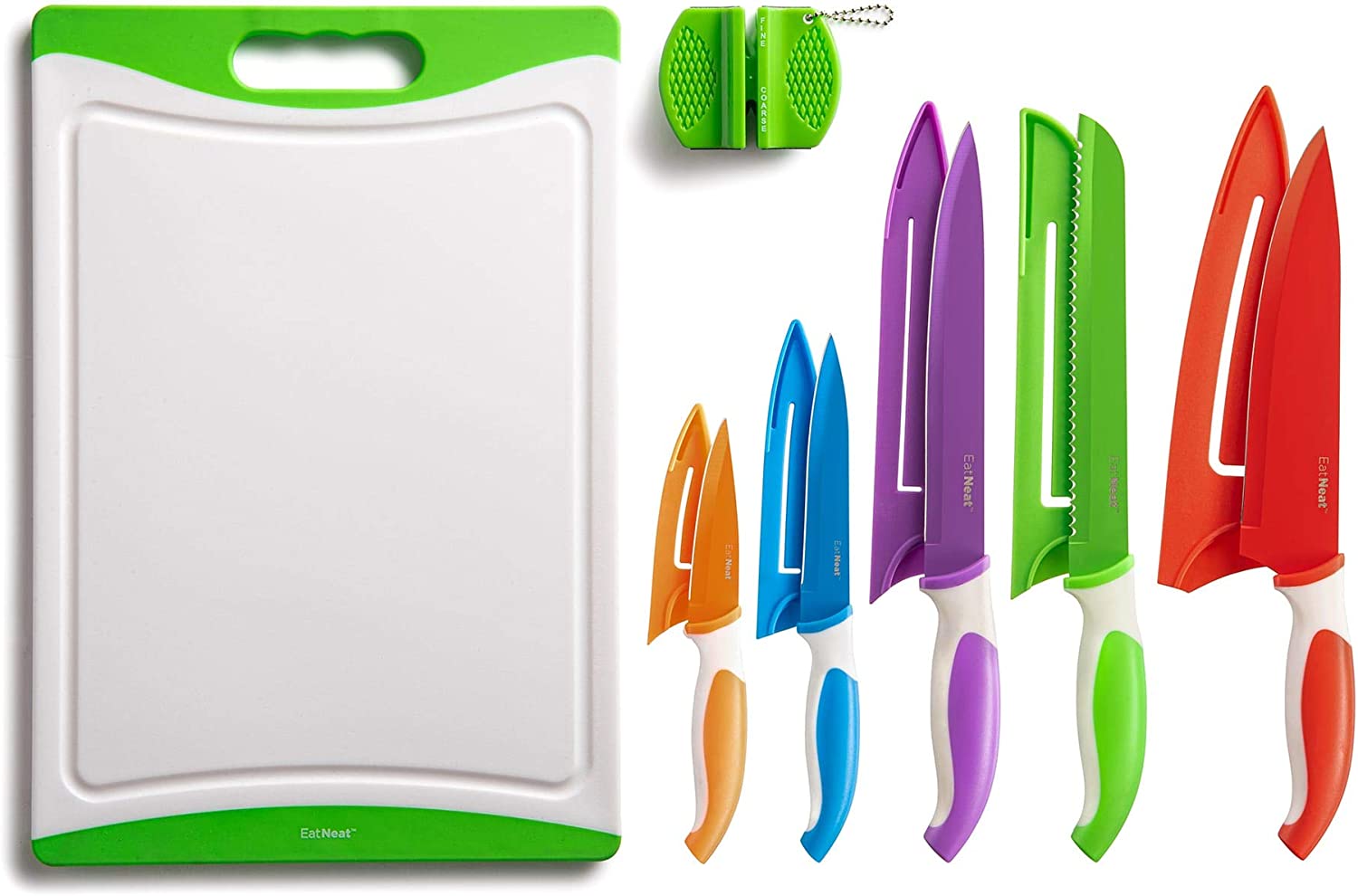 EATNEAT 12-Piece Colorful Kitchen Knife Set - 5 Colored Stainless Steel Knives with Sheaths, Cutting Board, and a Sharpener - Razor Sharp Cutting Tools that are Kitchen Essentials for New Home