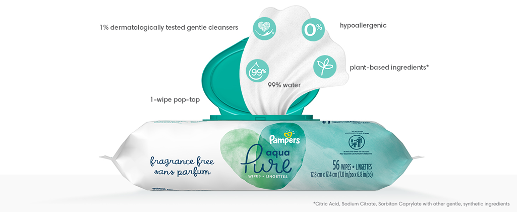 • Pampers Aqua Pure Wipes are made with 99% pure water for our simplest formula
