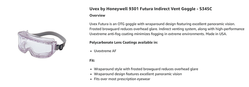 The Wrap-Around Sports Style Of The Uvex Futura Provides Excellent Panoramic Vision. Frosted Brow Guard Reduces Glare. Indirect Venting Increases Air Flow To Reduce Fogging.