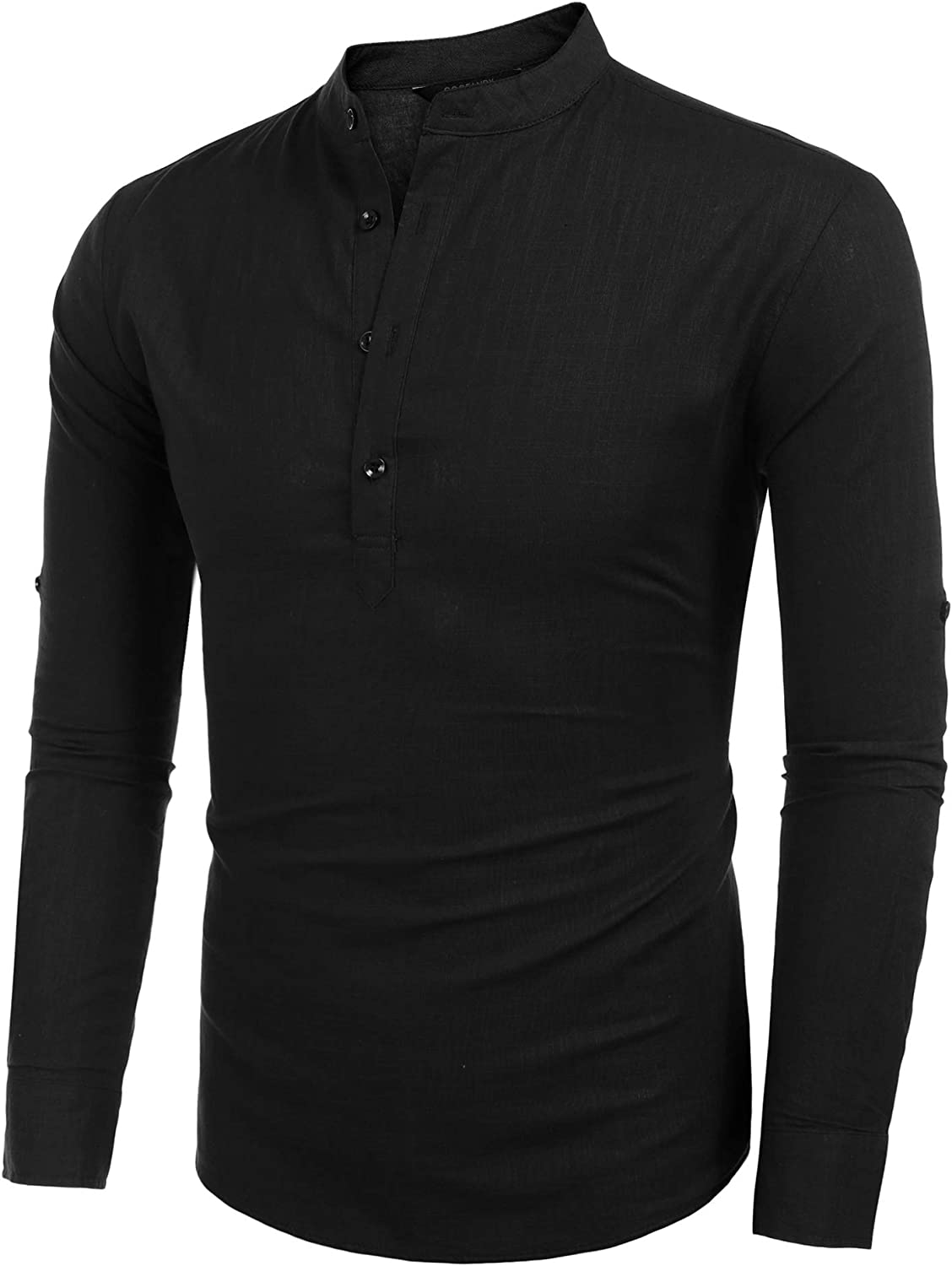 • 【STYLISH DESIGN】: Casual henley neck shirts, stand collar, simple style, solid color, slim fit, long sleeve(Roll-up), button-down closure, rounded hem, featured button detail.