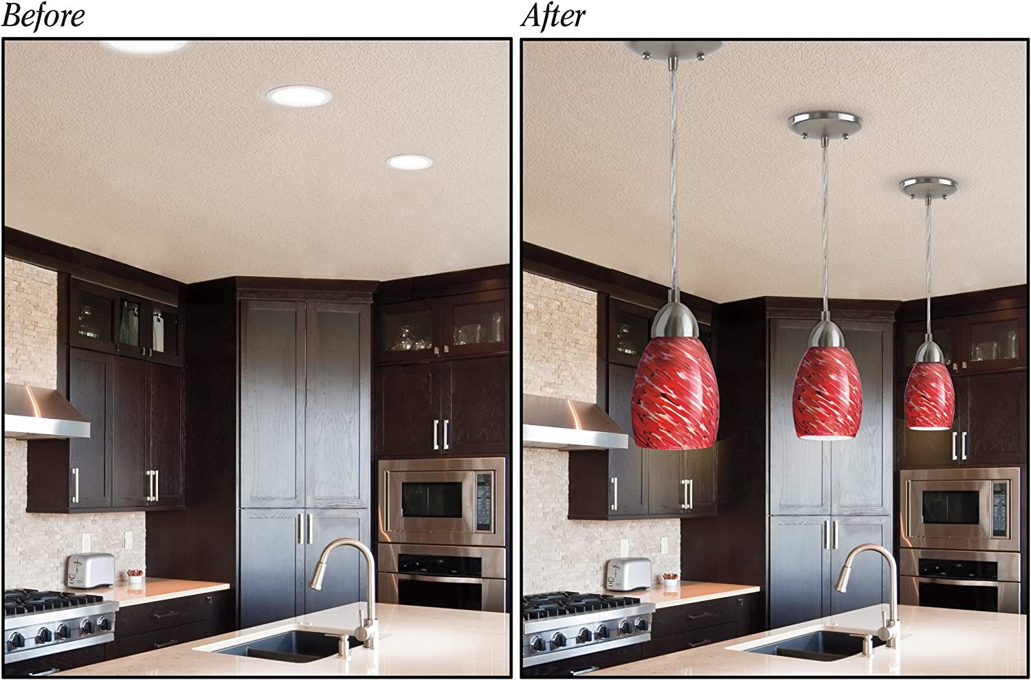 This unique patent-pending Westinghouse Recessed Light Converter offers an easy way to transform your existing recessed lighting into a pendant or light fixture with no major remodeling. Let your creativity inspire you to update your home lighting with this quick and easy upgrade. Hang any pendant or other light fixture of 50 pounds or less where recessed lighting is currently used in your home.The Recessed Light Converter adjusts to any can size between 4-inch and 6-inch, there are no visible screws or hardware and the decorative medallion can be painted to match any decor. This converter works with existing recessed cans that use medium base PAR16, R16, A19, R20, PAR20, BR25, BR30, R30, PAR30, BR38, PAR38, BR40 or R40 light bulbs and is suitable for damp locations.Perfect for kitchens, family rooms or anywhere recessed lighting is used. It includes a versatile white decorative medallion, adjustable bar, socket adapter and mounting hardware for convenient installation.This Westinghouse Recessed Light Converter is CETL listed for safety.Product reference number 01011.