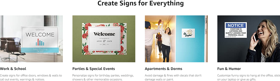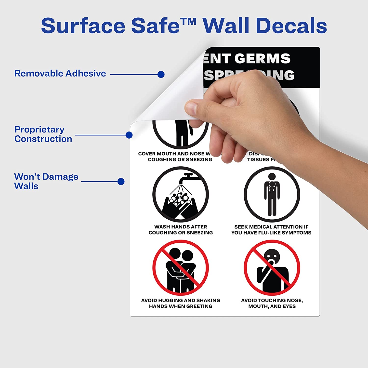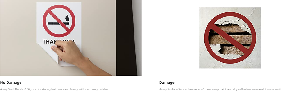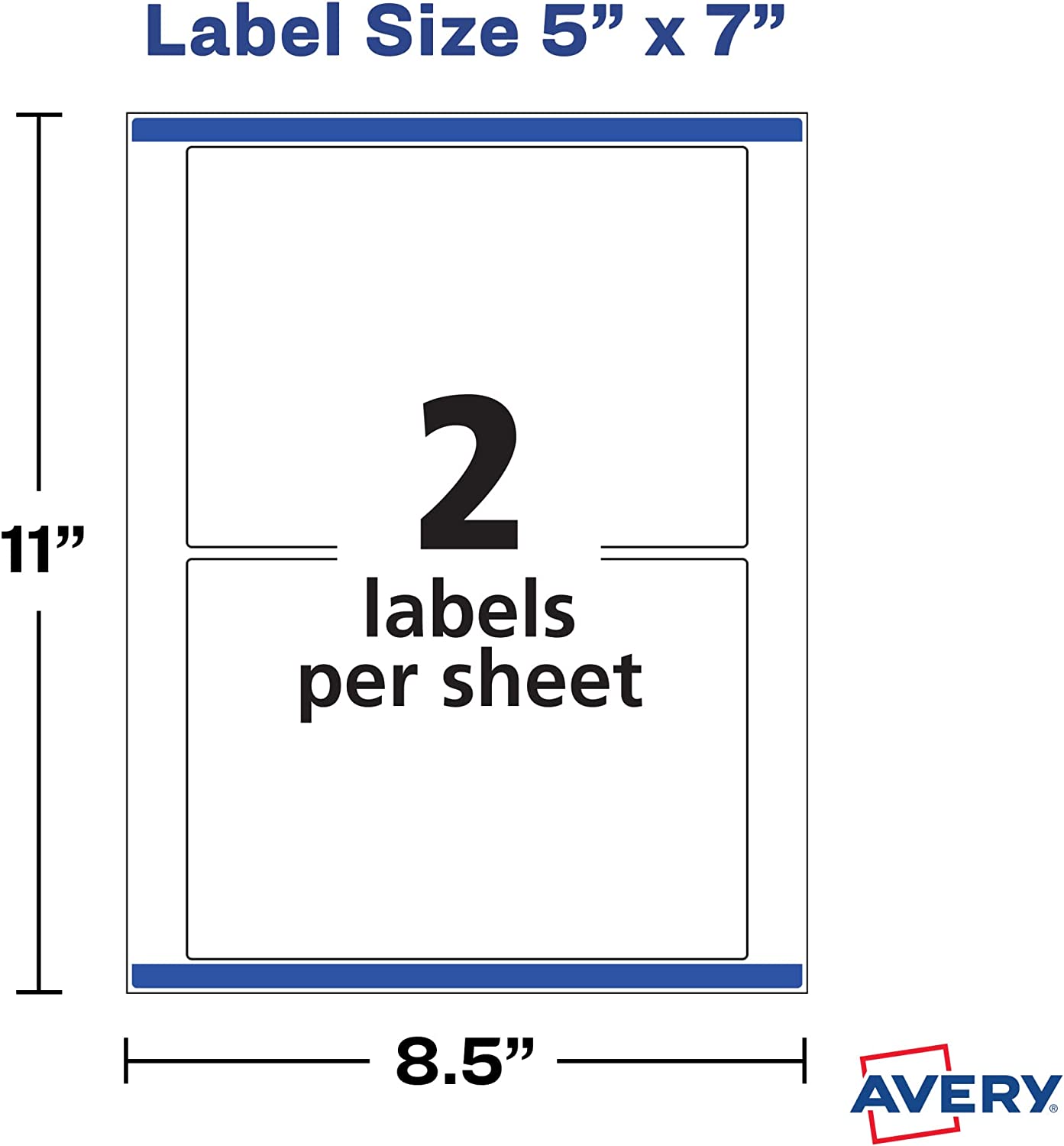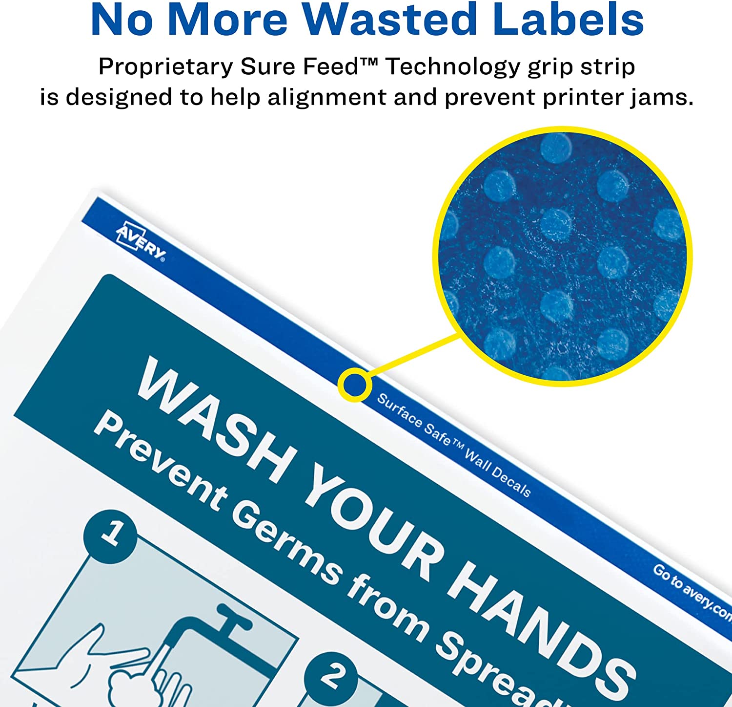 Effortlessly create custom signs and decals for your home, office or business with printable Surface Safe labels. These 5" x 7" blank matte white labels are made of durable, professional-grade material engineered to resist water, chemicals and abrasion, and hold up to all kinds of workplace and public enviornments. Surface Safe removable adhesive sticks strong and removes cleanly from painted walls, drywall, metal and glass without any residue or damage to surfaces. Our print-to-the-edge capability allows you to create eye-catching full bleed customized sticker labels with sharp text and crisp images printed right to the edge with no border or margin. Avoid printing misalignments and jams with Sure Feed technology that ensures a clean printing job when printing with your laser or inkjet printer. Create your own wall decals or use our free online software on the Avery site where you can choose from hundreds of pre-made sign designs and templates. Surface Safe removable label signs are perfect for creating event signs, office signs, promotional signs, notice signs, and more - place them with confidence, knowing your walls are safe.