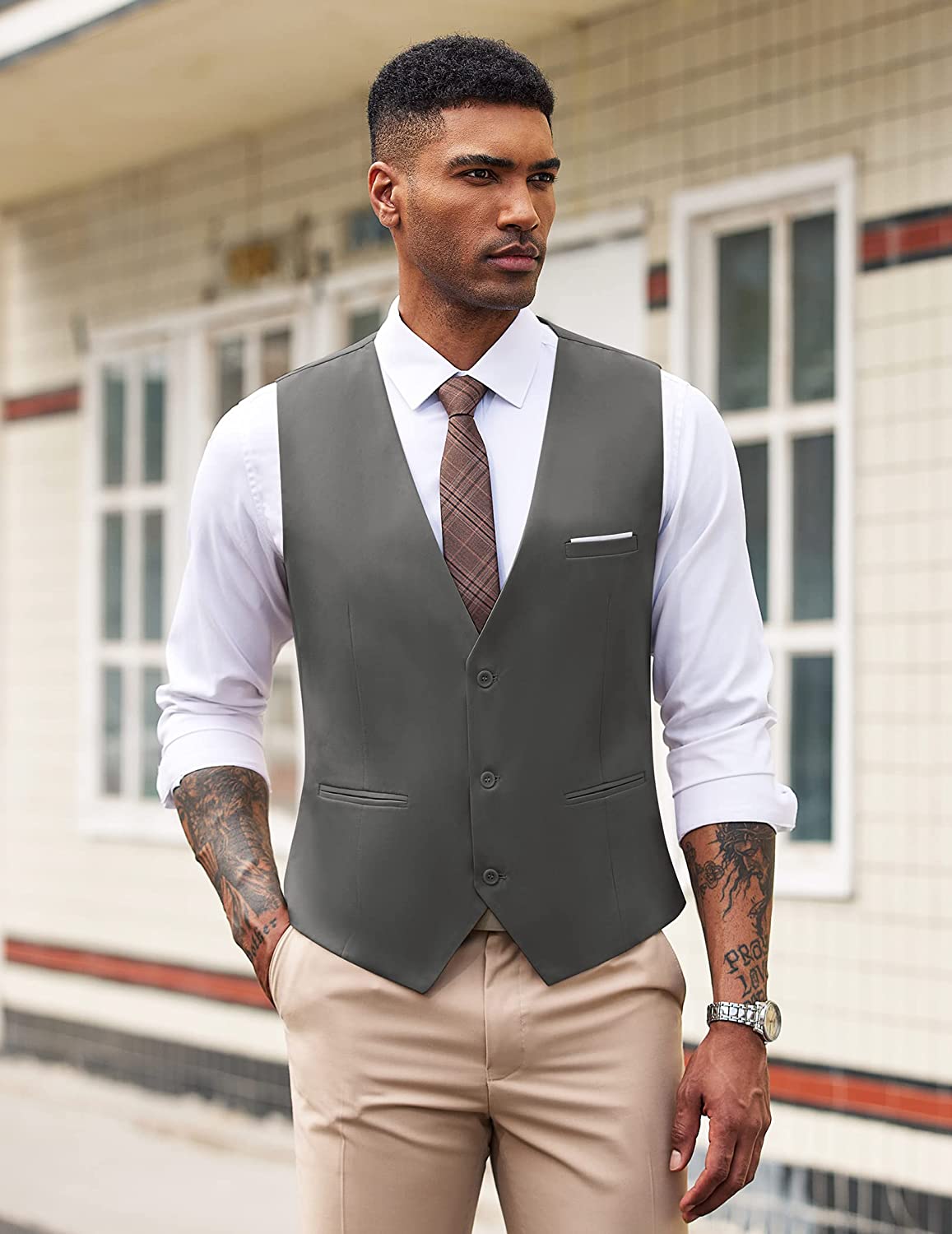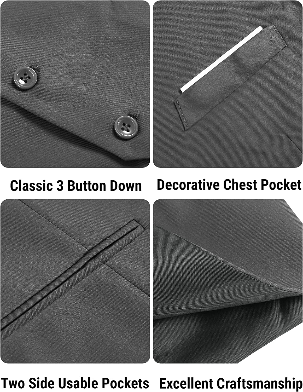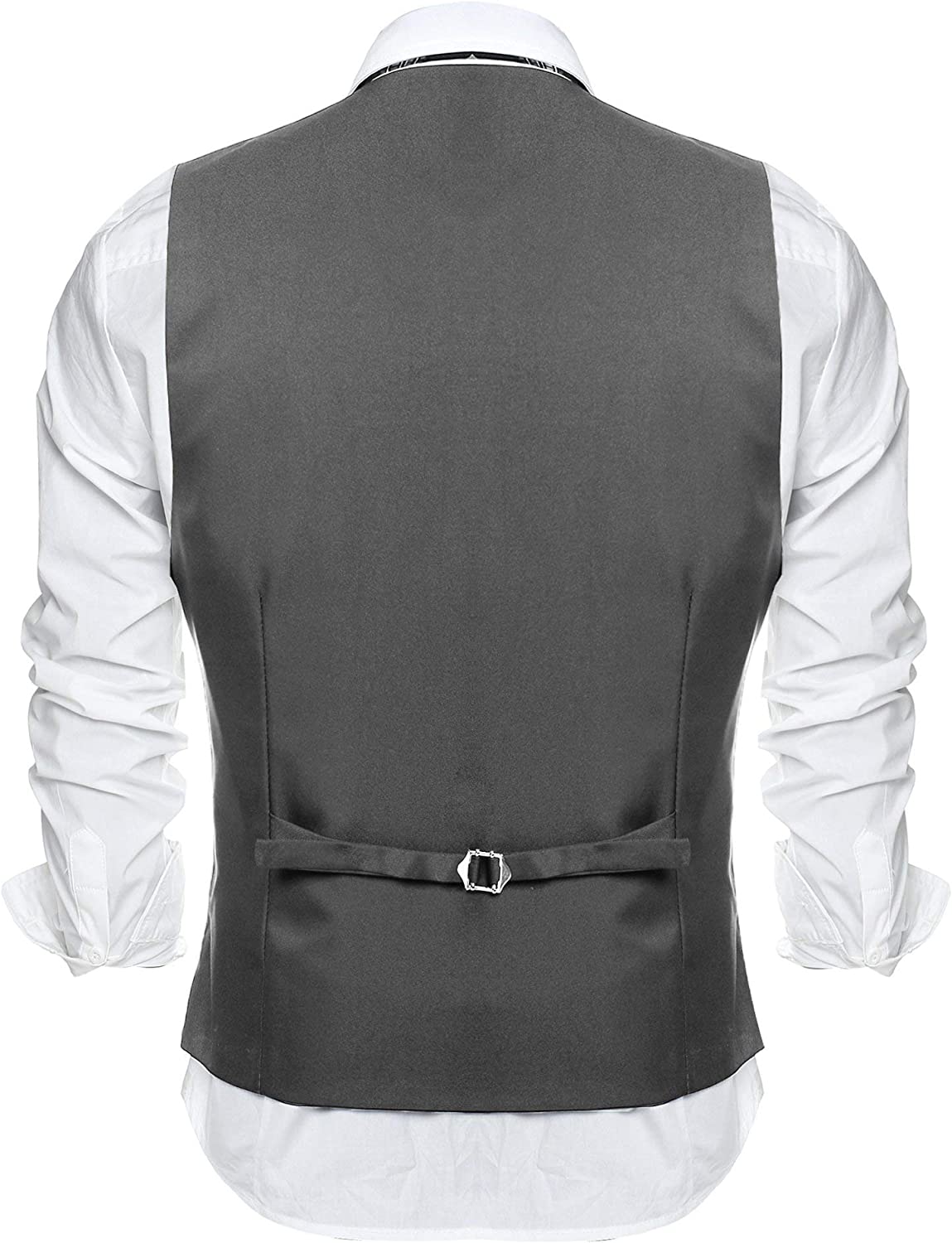 【Casual & Elegant Looking】Business vest is designed with classic solid color, V-neck, 3-buttons closure and 1 real pocket on the front, 2 real side pockets. The back adjustable Waistcoat offers a more accurate fit, makes you stand out in the crowd.