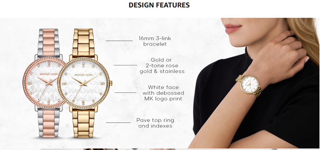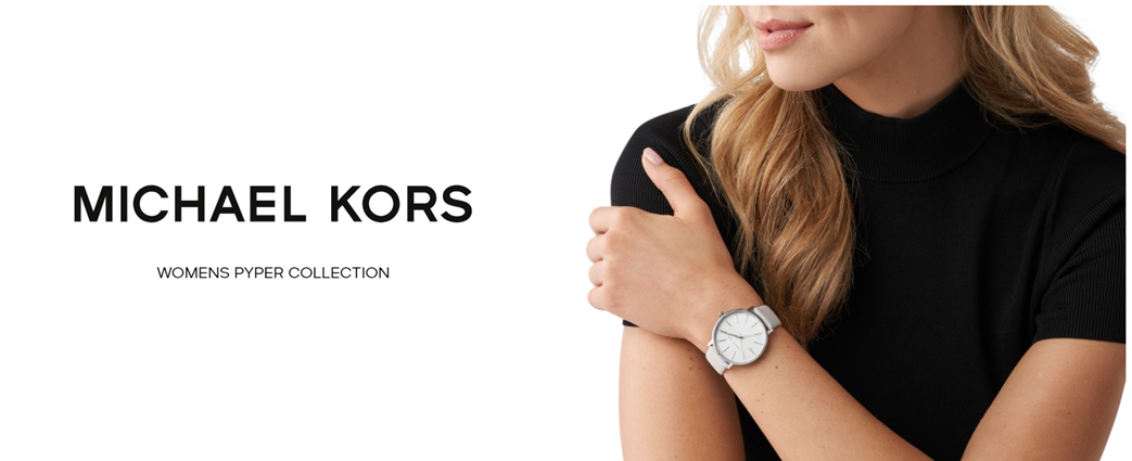 Watch Sizing Guide Find a confident ensemble with the addition of this sleek Michael Kors® Pyper watch. Stainless steel case. Leather strap with adjustable buckle closure. Round face. Three-hand analog display with quartz movement. Dial features gold-tone hands and hour markers, minute track, and Michael Kors detailing. Water resistant 165 feet. Display case included. Imported. Measurements: Case Height: 38 mm Case Width: 38 mm Case Depth: 7 3⁄10 mm Band Width: 17 mm Band Circumference/Length: 8 3⁄4 in Weight: 1.2 oz