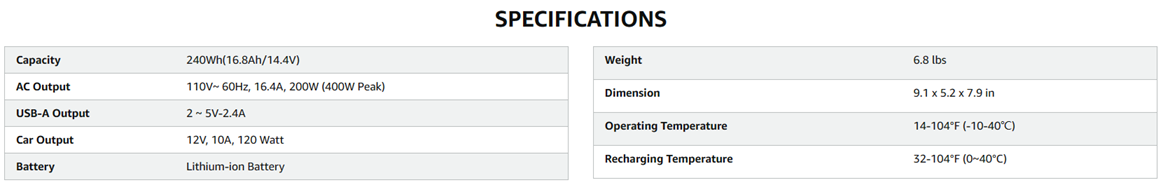 | Model Name | , 240Wh Emergency Backup Lithium Battery, 110V/200W (300W max.) Pure Sinewave |