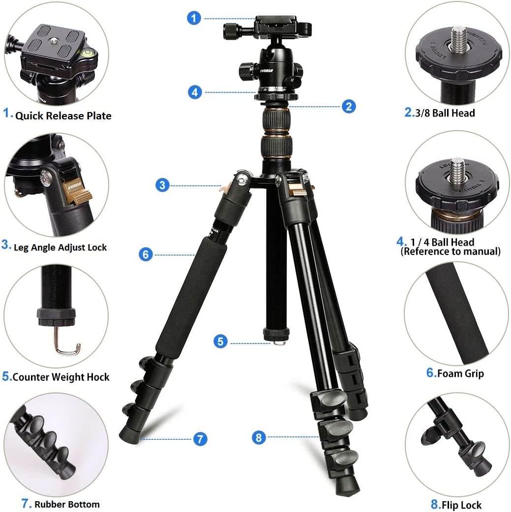 GWNNSH Camera Lightweight Travel Tripod, 58” Detachable Monopod, Aluminum Ball Head Stand 3 X Control Knobs with Calibration, DSLR QR Plate, Level Indicator, Flip Lock Design. Dare to Compare