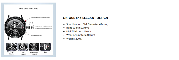 • UNIQUE ELEGANT DESIGN: Silver Pointer;Second,Minute and Hour Chronographs;Classic Calendar;