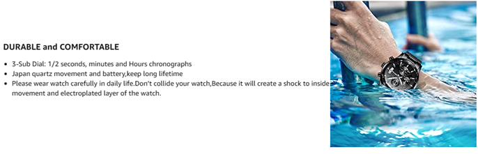 • WATERPROOF:3ATM,no problem for daily using. NOTE: DO NOT press any buttons in the water or wear this watch for longtime underwater activities - such as diving, ect.