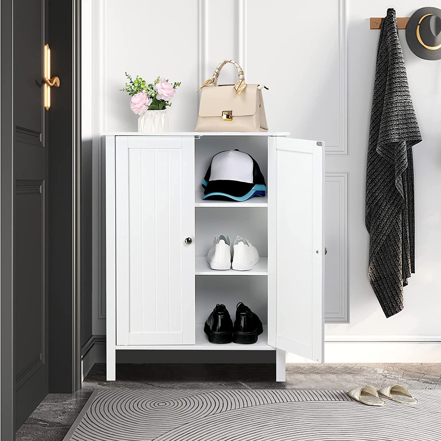 【Bathroom Enclosed Storage】--This storage cabinet features with 2 doors and 2 shelves adjustable at three different heights for easy taking and storage of your daily necessities with different heights