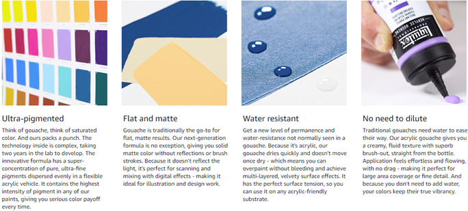 - Fluidity without water - traditional gouaches need water to ease their way. Our acrylic gouache gives you a creamy, fluid texture with superb brush out, straight from the bottle. Application feels effortless and flowing, with no drag
