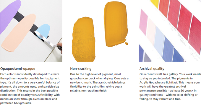 - Opacity – acrylic gouache pushes opacity to its limits. Each color is individually developed to create the optimum opacity possible for its pigment type, through a very careful balance of pigment, the amounts used, and particle size distribution