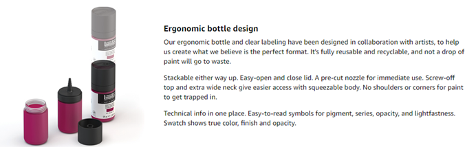 - The perfect bottle – easy-open and close lid, a pre-cut nozzle for immediate use, screw-off top and wider neck for easier access, and no shoulders or corners for paint to get trapped in