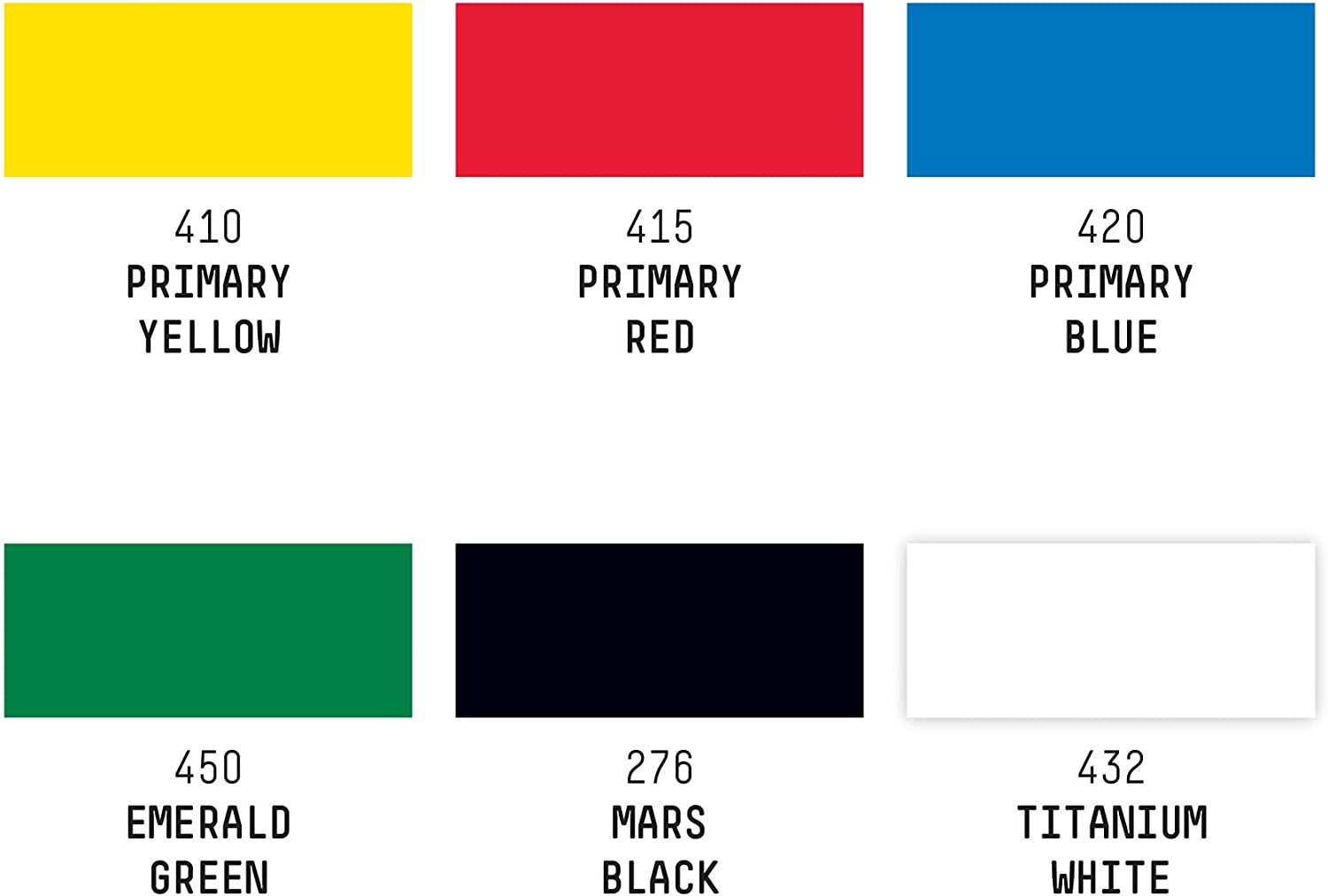 With these colors you have endless mixing possibilities, while Titanium white and Mars black can be used on their own, or to tint and shade. In a choice of set sizes. Contains: primary yellow, primary red, primary blue, Emerald green, Mars black, Titanium white