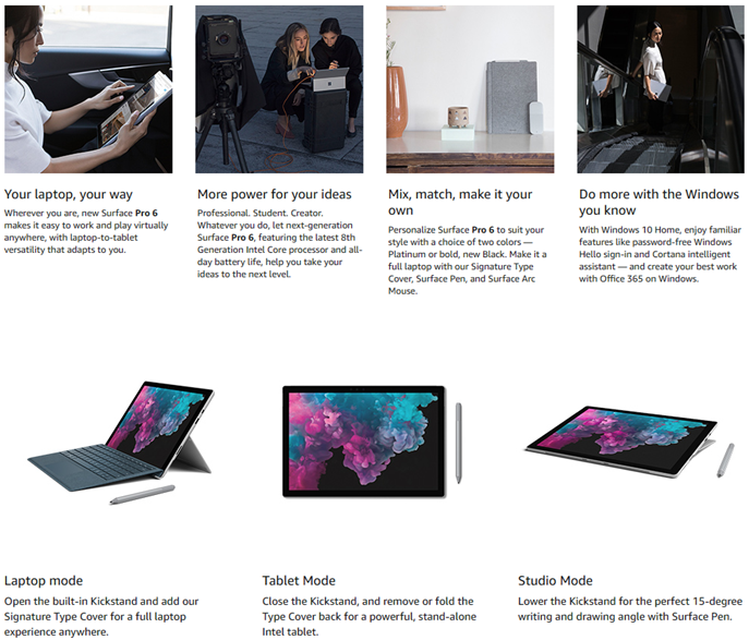 Unplug. Pack light. Get productive your way, all day. Collaborate on projects, perfect a presentation, manage email, and stream a show when it's all done. From office to home, airport to open road, power your life on the move with new Surface Pro 6, the laptop that adapts to you now more powerful than ever with the latest 8th Generation Intel Core processor for faster, smoother multitasking.