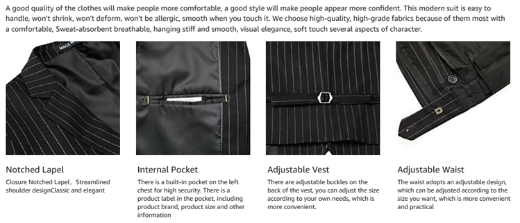 Button Fly closure, slim fit notch lapel flap pocket. Premium center vent two-button single breasted stripe suit jacket with matched four-button vest with back adjustable belt for better fit and classic trousers.