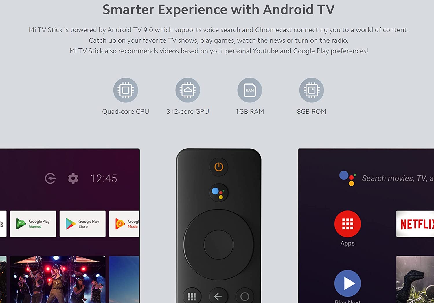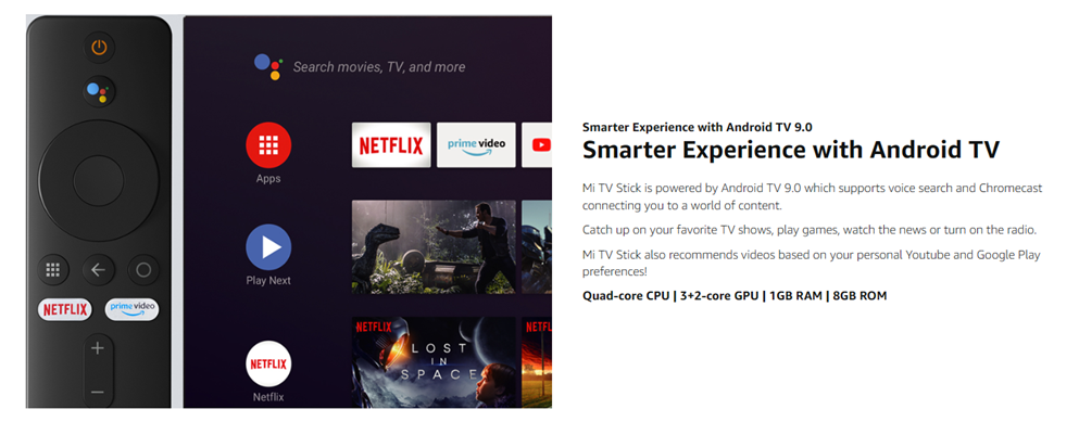 • Smarter Experience with Android TV: Mi TV Stick is powered by Android TV 9.0 which supports voice search connecting you to a world of content. Catch up on your favorite TV shows, play games, watch the news or turn on the radio. Mi TV Stick also recommends videos based on your personal Youtube and Google Play preferences!