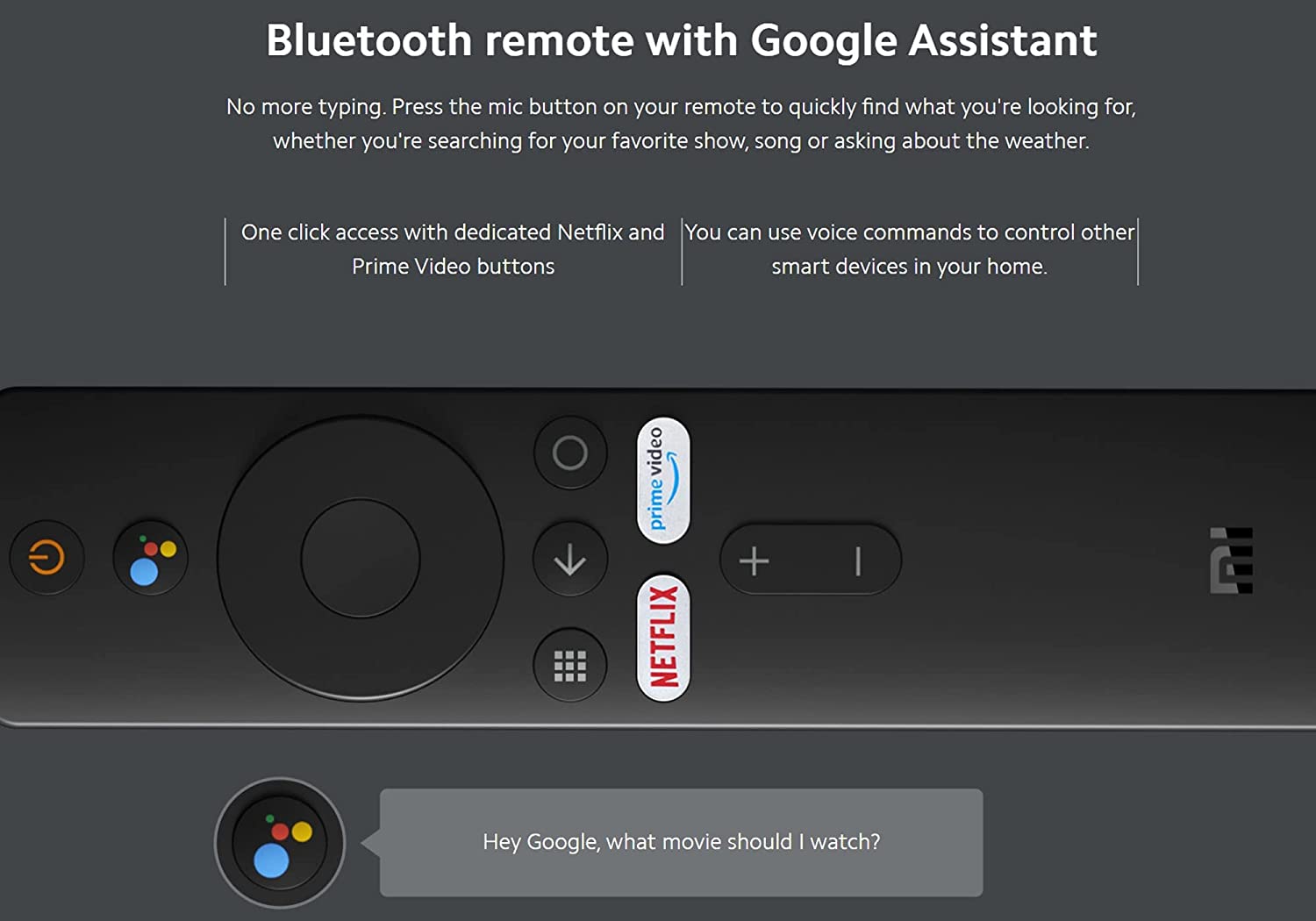 • Bluetooth remote with Google Assistant: No more typing. Press the mic button on your remote to quickly find what you're looking for, whether you're searching for your favorite show, song or asking about the weather.