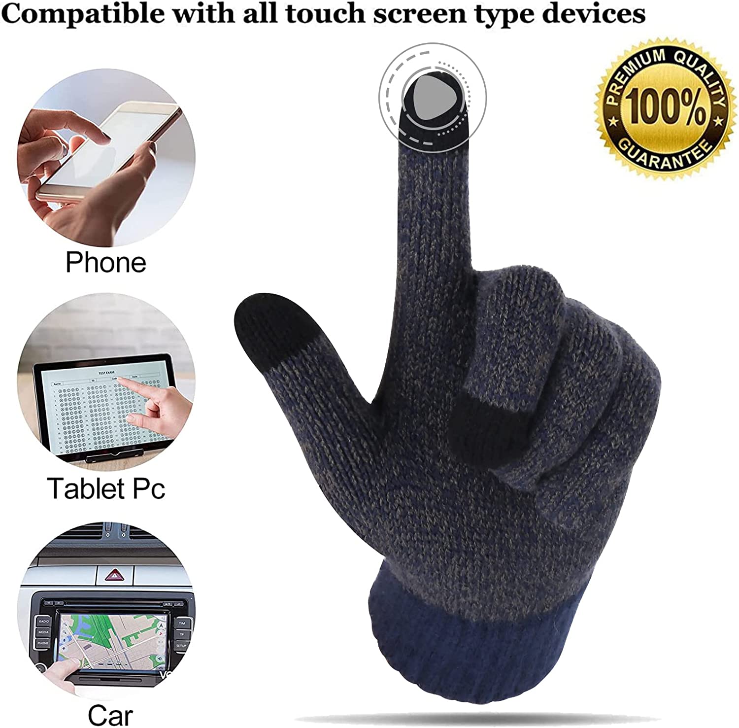 • Touch Screen Knit Gloves - Equipped with upgraded touch screen conductive fabric on the thumbs, index fingers and middle fingers; You can use the smartphones, iPads, car touchscreen and other touchscreen devices normally without taking the gloves off.