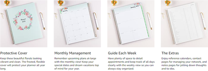 Bring order to your busy life with the Laurel Planner and its springtime motif to give your schedule a fresh start. Thick, premium-quality pages reduce ink bleed-through to ensure your writing stays legible. Two-page-per-week spread features ruled, daily blocks for easy handwriting. Monthly view per two-page spread includes a notes section for important projects. Monthly tabs are coated for durability. Durable, frosted flexible front cover keeps your pages protected throughout the entire year. Double-wire binding allows easy page-turning. Six bonus monthly views allow you to make easy yearly transitions. Planner also includes pages for yearly goals, contacts, reference calendars and extra notes pages. 12-month planner ranges from January to December.
