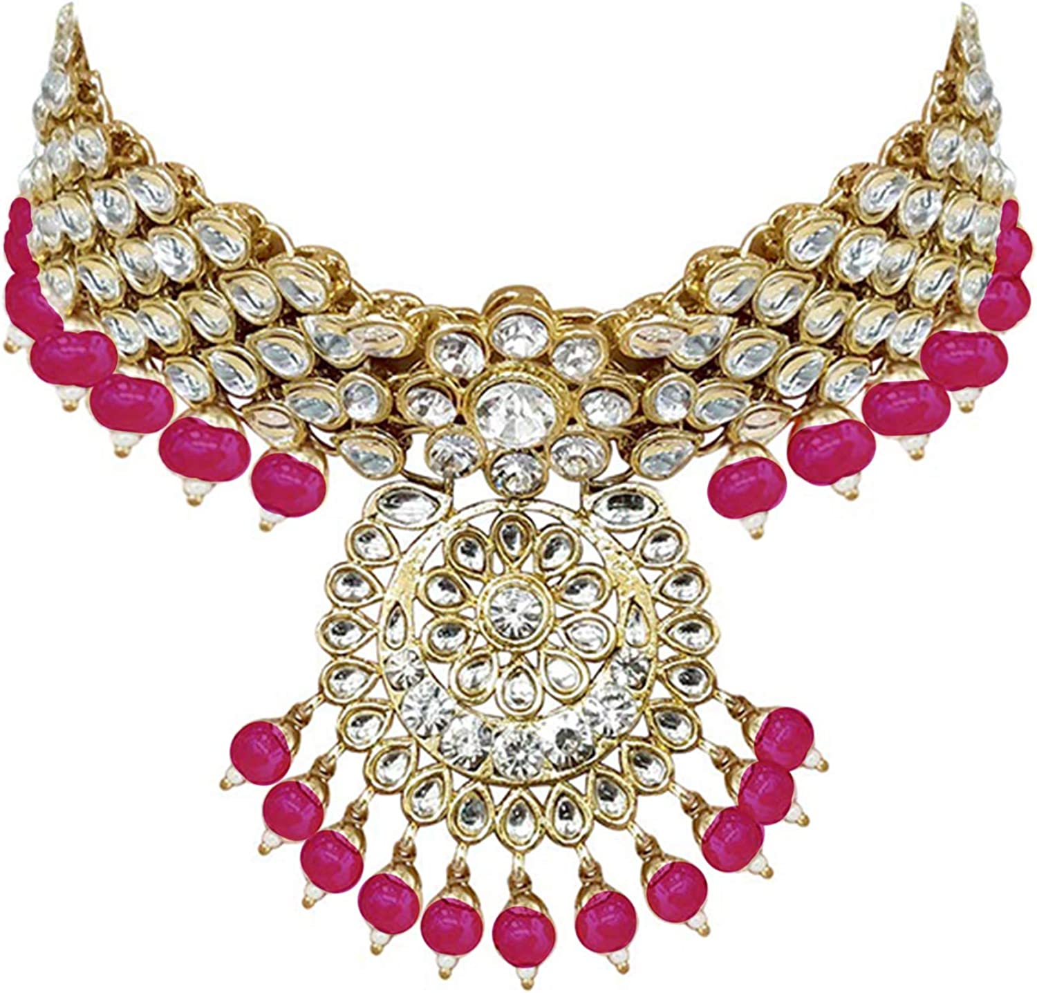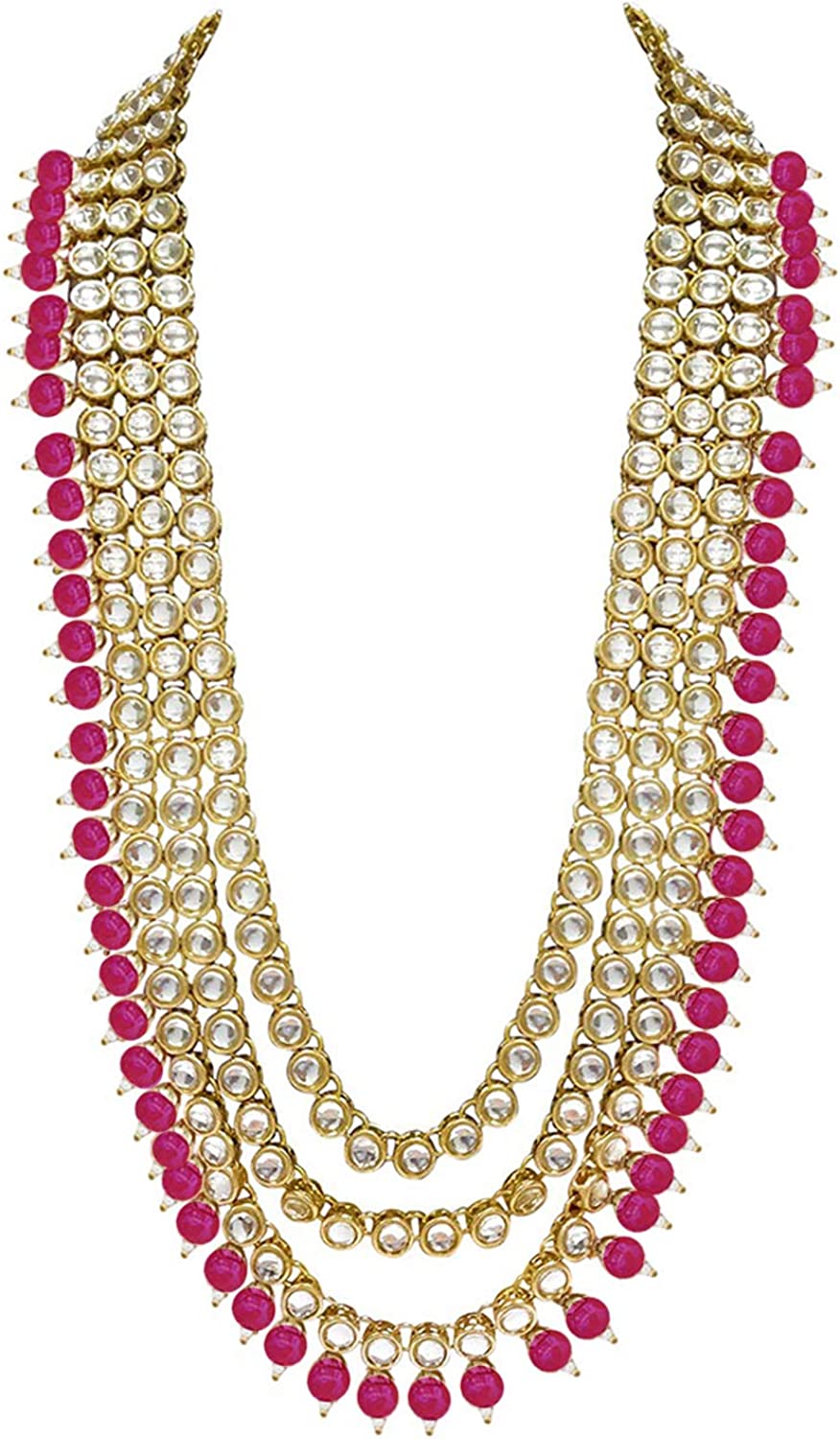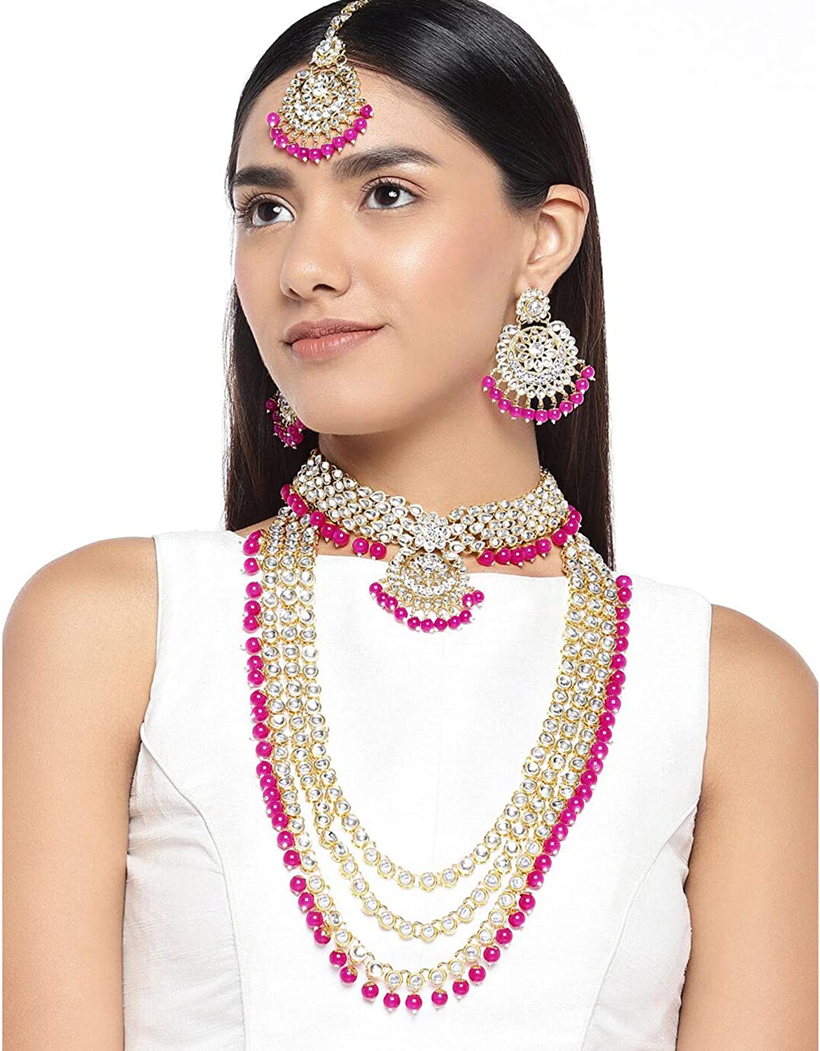 Aheli Indian Wedding Kundan Beaded Bridal Long Choker Necklace Earrings with Maang Tikka Traditional Jewellery Set for Women
