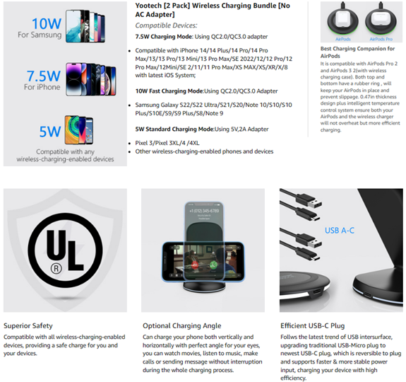 - 【PACKAGE & SERVICE】Compare with similar items, you will get 1 x wireless charging pad, 1 x wireless charging stand, 2 x 3. 3ft USB Type C Cable, 1 x User Manual and reliable 12-hour response service. At Yootech, ZERO Risk purchase is for every customer's smiles.