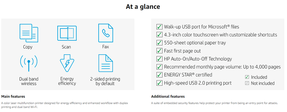 It's built to keep your business moving forward—the HP Color LaserJet Pro MFP M479fdw keeps up with how you actually work, collaborate, and get things done. With fast print, scan, copy, and fax capabilities, best-in-class security, and automated workflows, this multifunction color laser printer is designed to let you focus your time on growing your business and staying ahead of the competition. Maximize productivity with an intuitive 4.3" color touchscreen control panel, and stay connected with easy mobile printing options. This wireless color laser printer is also designed with the environment in mind; save up to 18% energy over prior products without compromising productivity, and help save paper right out of the box with the default paper savings mode.