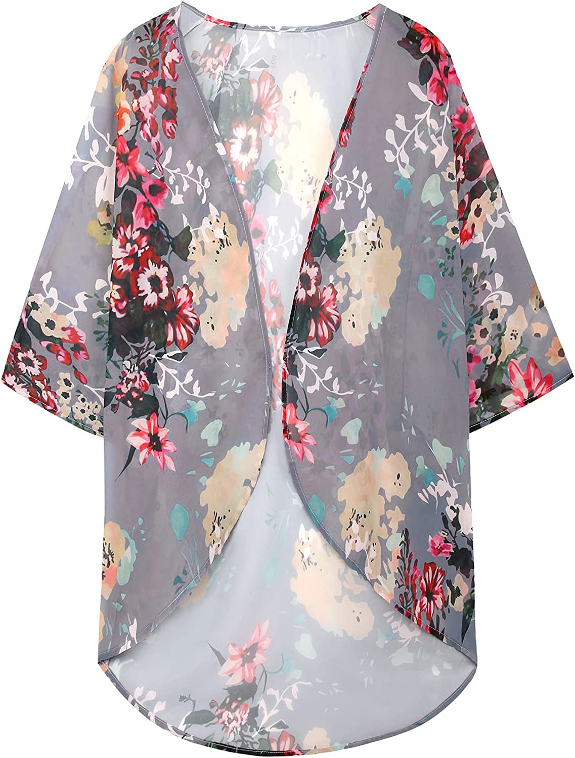 Women's Floral Print Puff Sleeve Kimono Cardigan Loose Cover Up Casual Blouse Tops