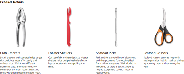 - Professional Seafood Tools Set includes 6 zinc alloy crab crackers, 6 Food-Grade plastic lobster shellers, 6 stainless steel crab leg forks/picks, 2 stainless steel seafood scissors and 1 cotton storage case. Our versatile set is a must-have in any kitchen, restaurant or parties and makes a fantastic gift to anyone with taste for seafood