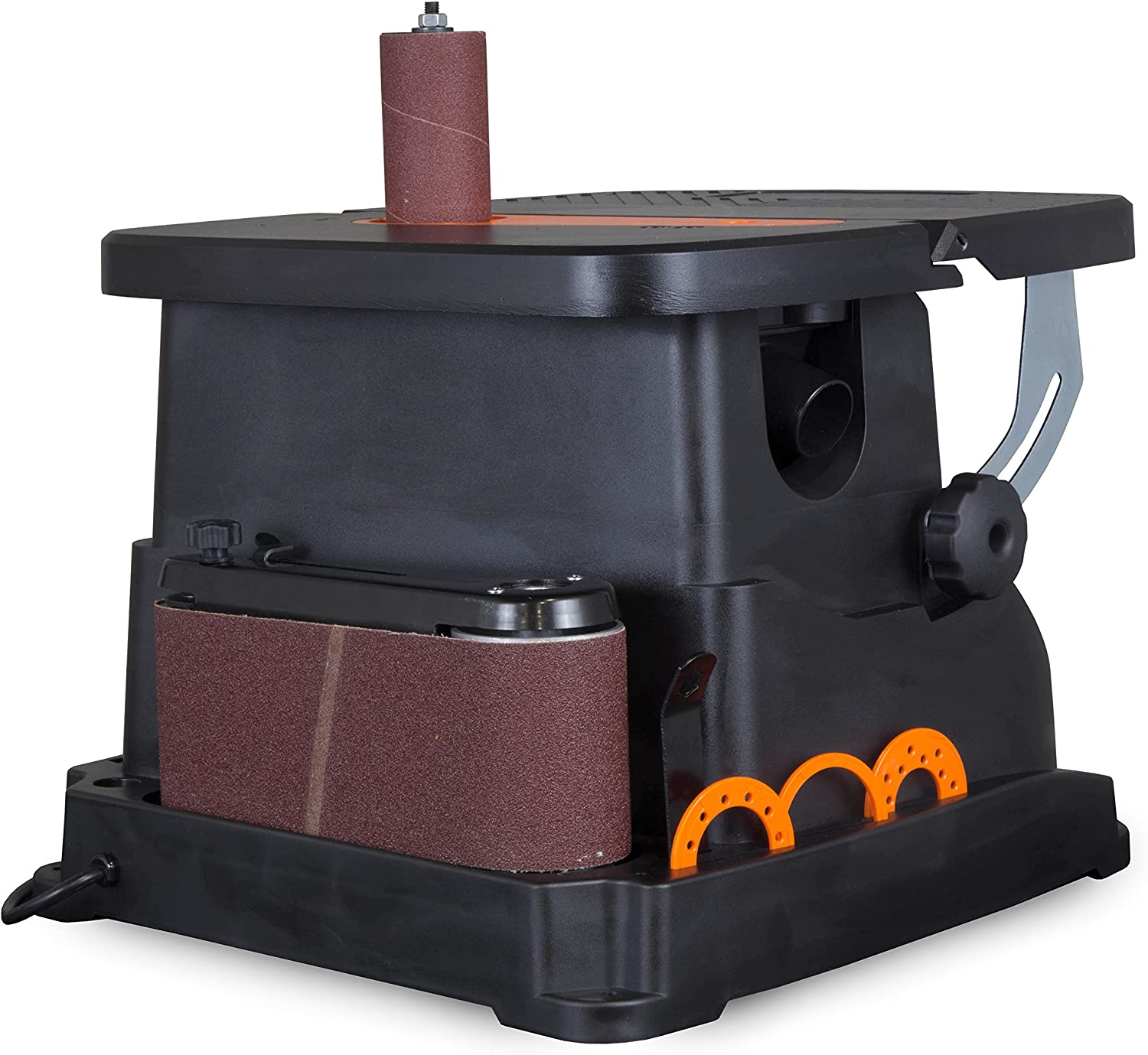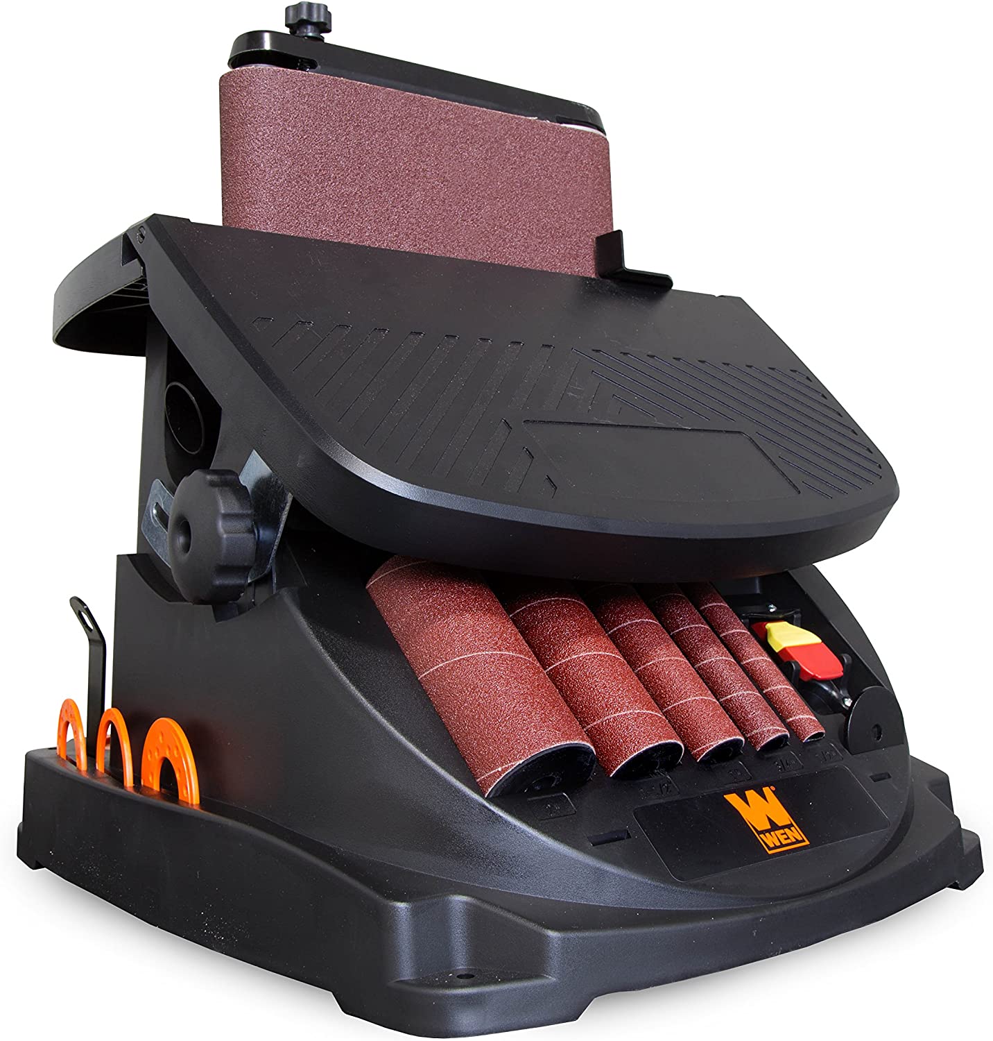 Remember when you were the king of the twist? Now you can make your belt oscillate without ever setting foot on a dance floor with the WEN Oscillating Belt and Spindle Sander. Sand arcs, curves, contours, faces and more of even the most strangely shaped workpieces. This versatile machine acts as both a spindle sander and a belt sander, oscillating up to 58 times per minute with a 5/8-inch stroke. This package includes five different spindle sanding sizes (1/2 inch, 3/4 inch, 1 inch, 1-1/2 inch and 2 inch) and one 4 x 24 inch belt. The powerful 3.5 amp motor rotates the various spindles up to 2000 times per minute and the belt up to 1575 feet per minute. Onboard storage helps to organize all of the throat plates, rubber sanding drums and table inserts included with this sander while the 1-1/2 inch dust port allows woodworkers to connect a dust collection system to minimize clean up. Adjust the table anywhere from 0 to 45 degrees to help take on angled edges and surfaces. This sander also comes with six pieces of 80 grit sandpaper: one for the belt and five for each respective size spindle diameter. And because its a WEN Product. a nationwide network of skilled service technicians and a friendly customer help line. It’s time to shake things up with the WEN Oscillating Belt and Spindle Sander. Remember when you could easily sand any curve or edge your heart desired? Remember WEN.
