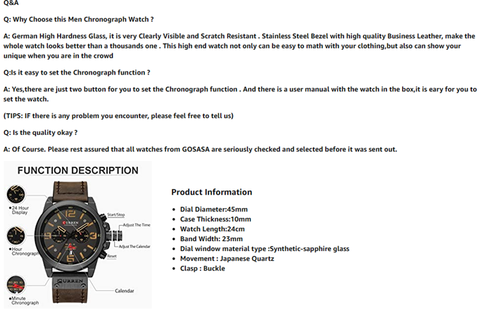 • Multifunctional watch, All the pointers are working, This watch has a chronograph function,30M waterproof and Date Display