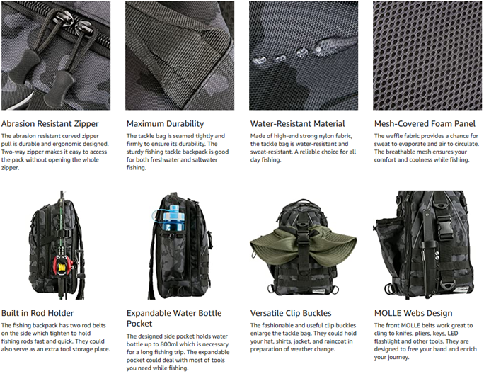- 【Water-Resistant & Durable】Made of high density strong nylon fabrics with extra firm stitches, the water-resistant fishing backpack is durable for long-term use. With our abrasion resistant materials, you can take this fishing tackle bag to any freshwater or saltwater fishing trips.