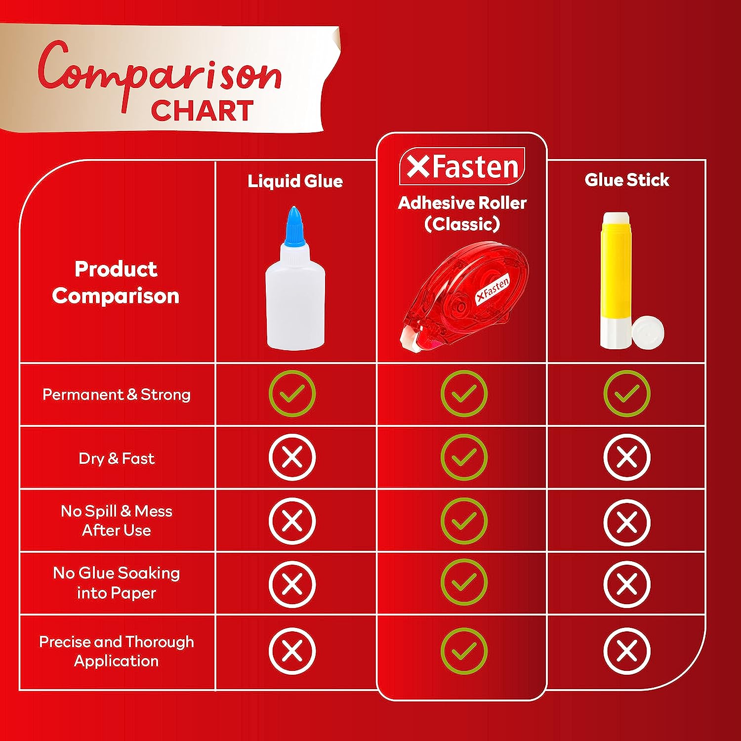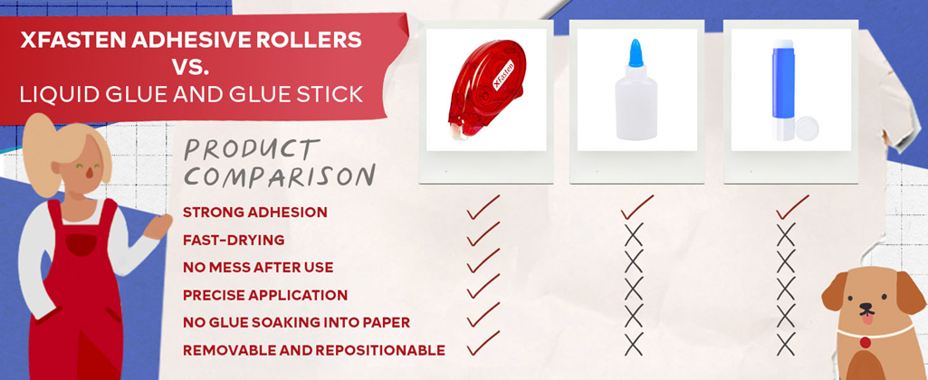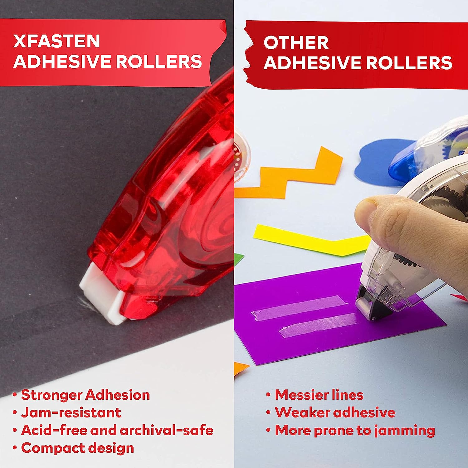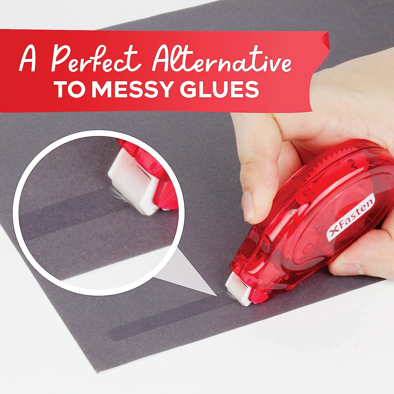 CLEAN AND MESS-FREE APPLICATION. Unlike liquid adhesives, these double sided tape rollers do not create a mess or leave a residue. They are clean and easy to use, making them ideal for use in various environments, including schools, offices, and homes.
