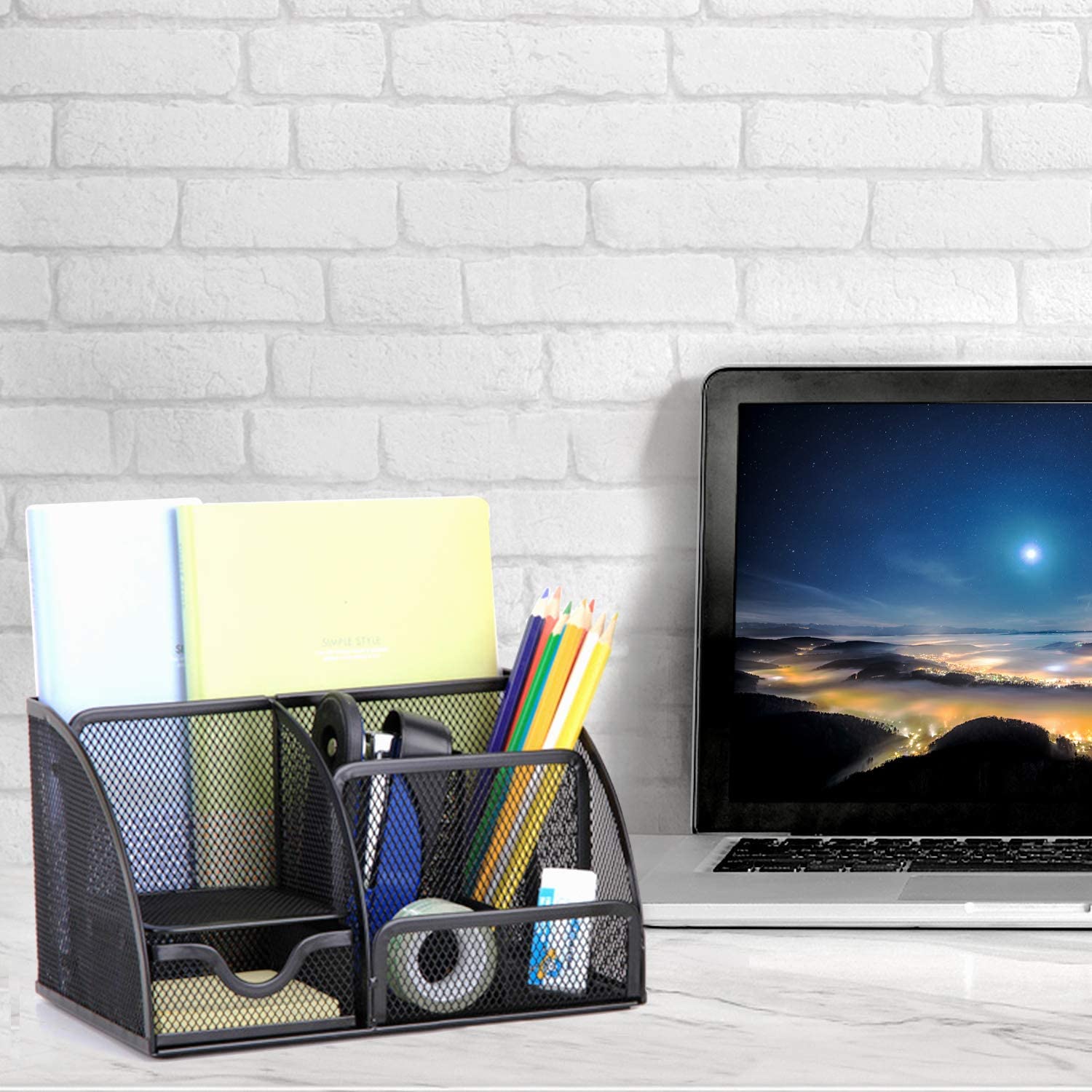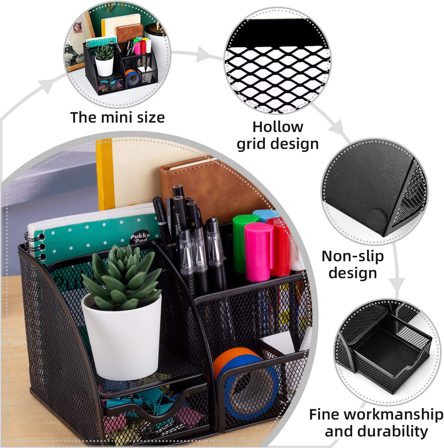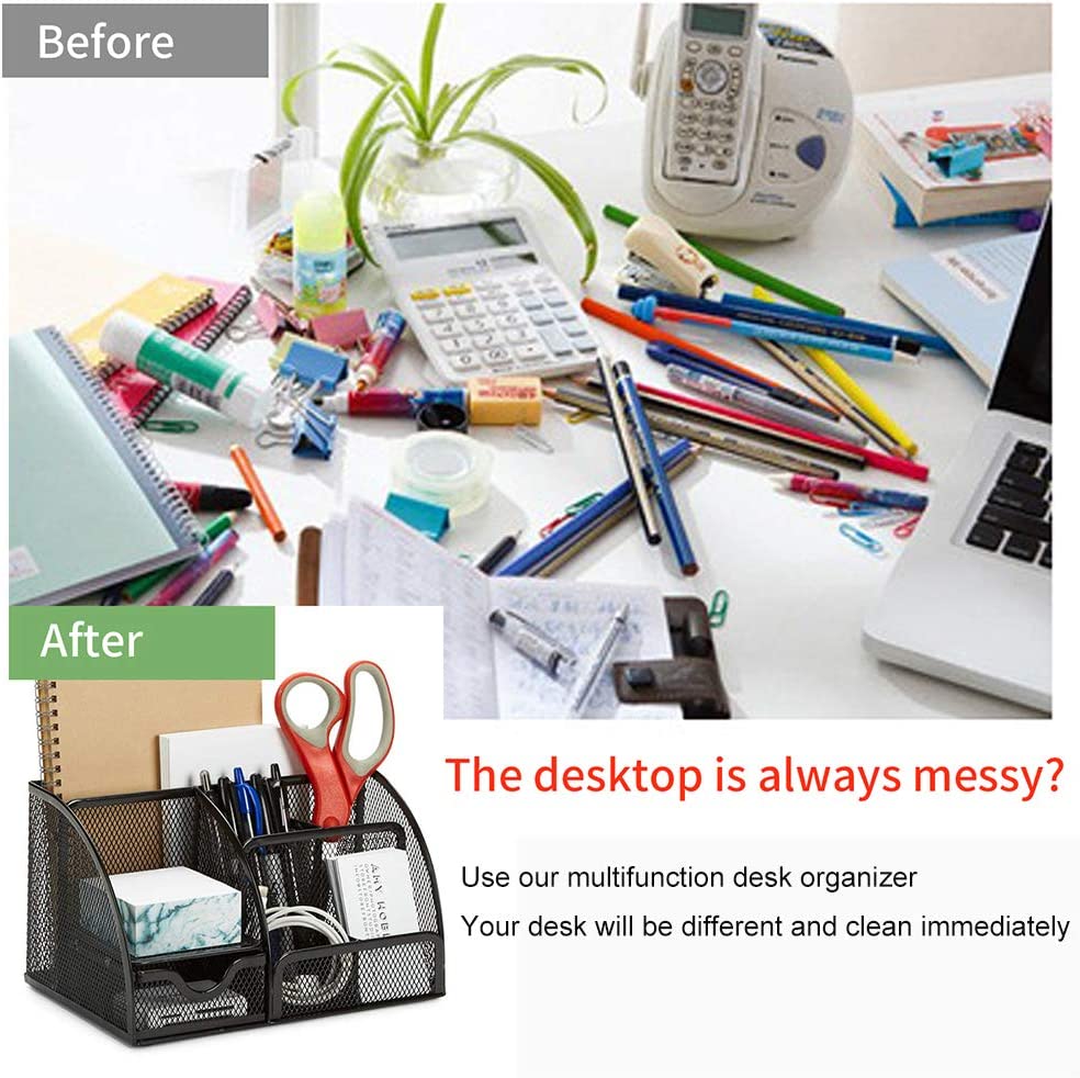 • 【Office Desk Organizers and Accessories】 Durable Sturdy Stylish Material: The desk organizer is made of quality mesh metal - durable, compact and smart-looking and will keep the stuff you need at hand while staying out of your way.