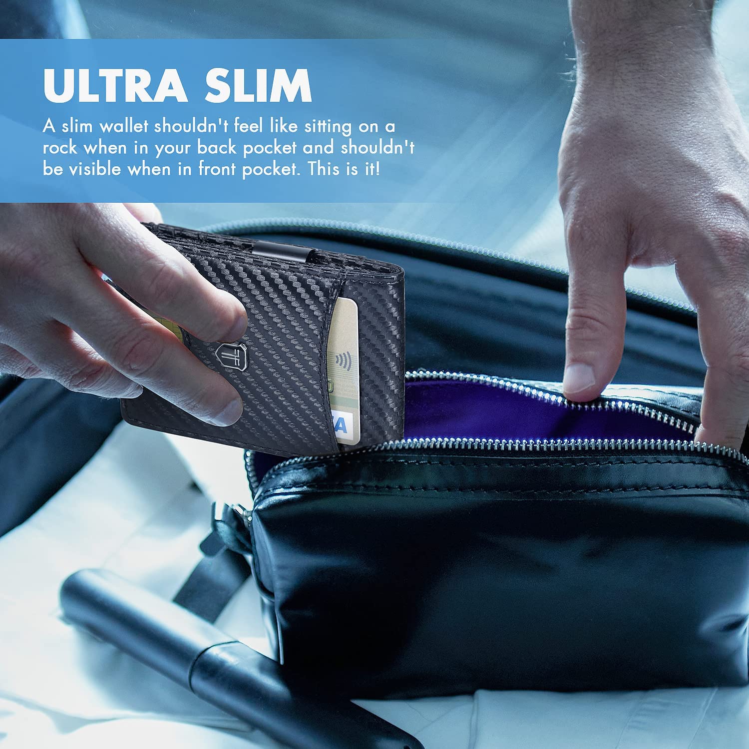 ULTRA SLIM & MULTIFUNCTIONAL - Best slim wallet that measures only 3.9"x2.76"x0.34". A men’s wallet with enough room for essential cards and cash without being bulky. Front pocket for the most used cards for quick access. Outside pocket for ID cards so you don’t have to open the whole wallet