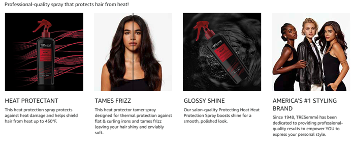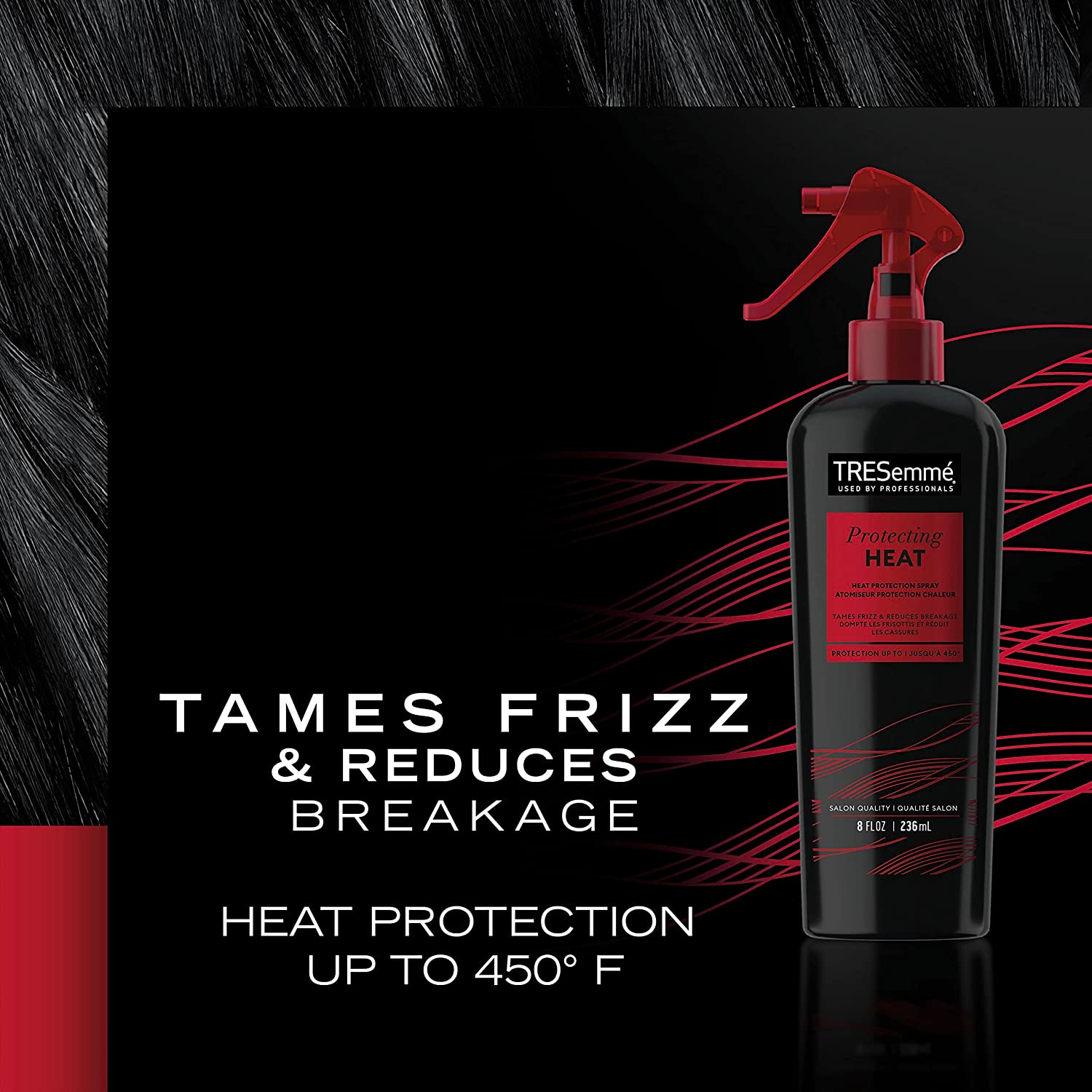 Most of us are guilty of going straight for our heat styling tools, but eventually, that heat causes split ends and dry hair. So, before you heat style, you need a hair protectant spray to prep and protect your locks. Use TRESemmé Protecting Heat Spray for a finished look that's shiny and undeniably soft. Would you ever grab a hot pan without oven mitts? No. And when heat appliances like flat iron spray and curling irons can reach up to 450°F, you should never use them on your hair without a heat protectant spray for hair either. Our TRESemme Heat Protection is a hair heat protectant designed to enhance hair's flexibility to re-form and hold its shape without getting damaged for ultimate hair heat protection. It's perfect hair protection from heat for those of us who love to style but need to restore vibrancy and shine to dried-out, damaged hair. How to use: Spray this heat protection spray on your hair liberally 6-8 inches away, from mid-shaft to ends, on both damp hair before you blow-dry and dry hair before curling or flat ironing. TRESemmé is an industry leader in providing you with salon-ready hair quality products.