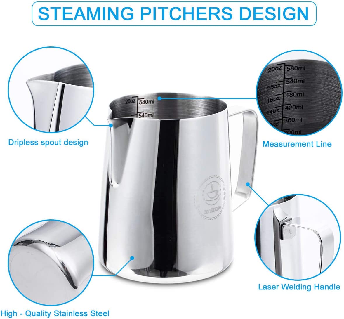 - ☕【Convenience & Accuracy】This precise capacity of 20oz milk frother pitcher has engraved the liquid measurement on both sides, makes it easy to read, it is perfect for 2 or 3 cups of cappuccinos or espressos needs.
