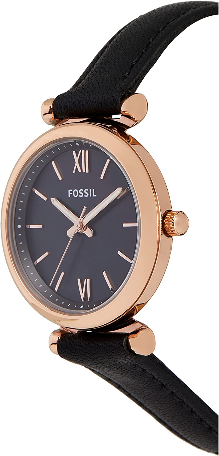 - Rose gold-tone stainless steel case with black mother of pearl dial; genuine black leather band with adjustable buckle closure; interchangeable with all 12mm Fossil straps