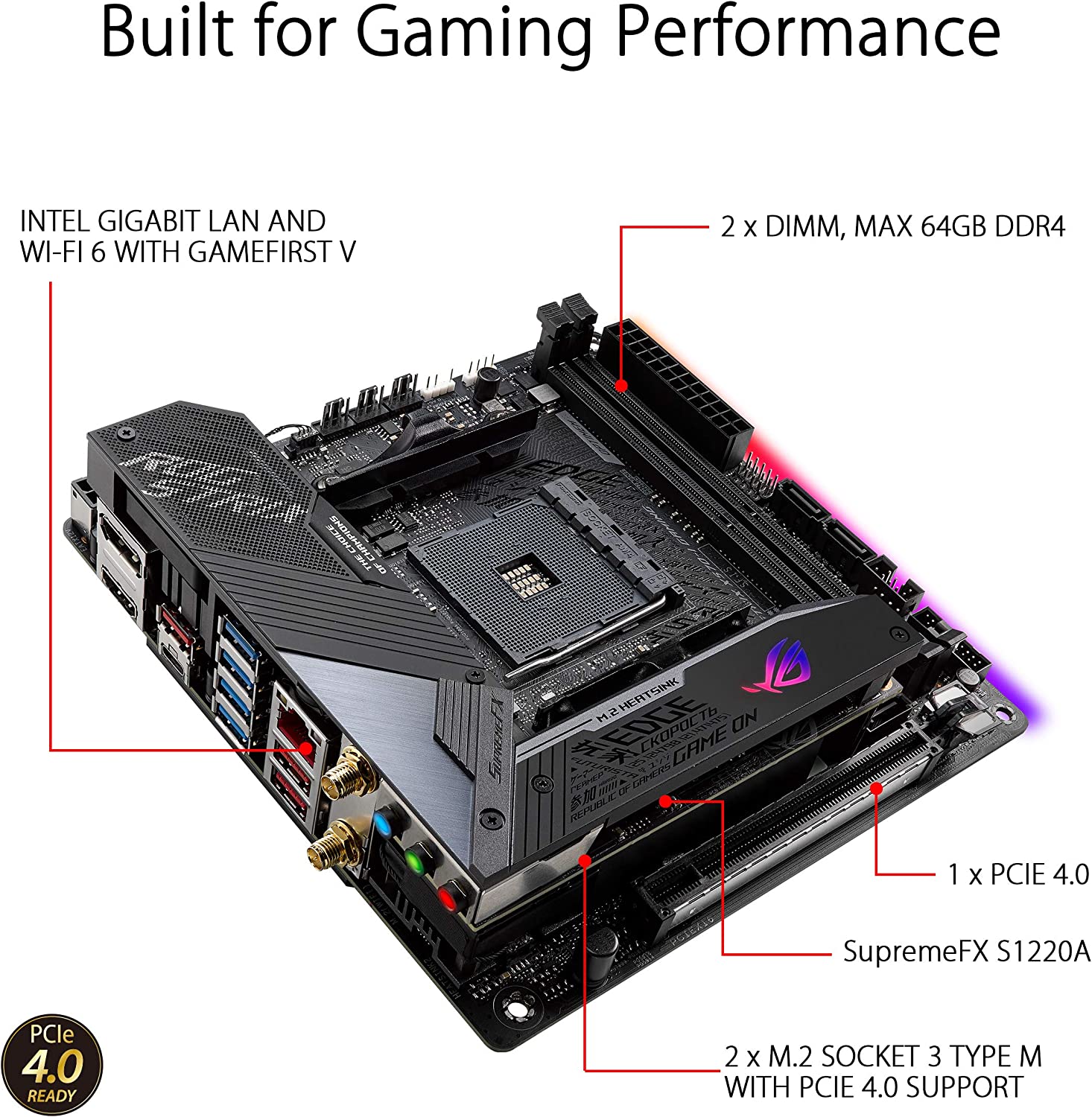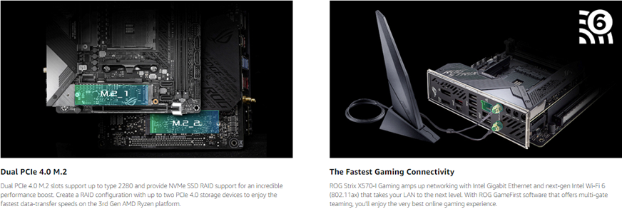 • Next-gen gaming connectivity: features PCIe 4. 0, HDMI 2. 0, DisplayPort 1. 4, Dual M. 2, USB 3. 2 Type-A and Type-C connectors.