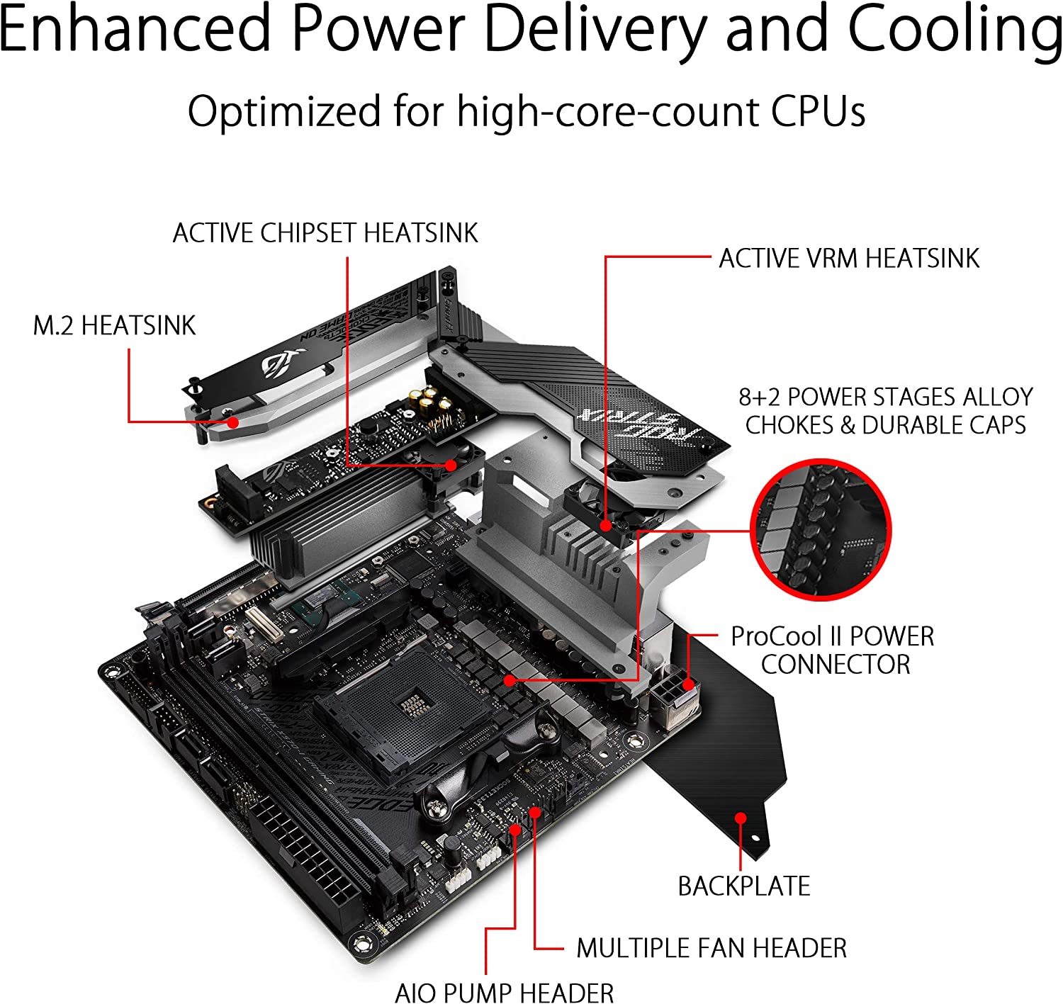 • Comprehensive cooling design: features an actively-cooled VRM, Chipset combo heatsink and heat pipe to absorb and rapidly dissipate heat, meanwhile paired with AIO pump header and multiple chassis-fan header.