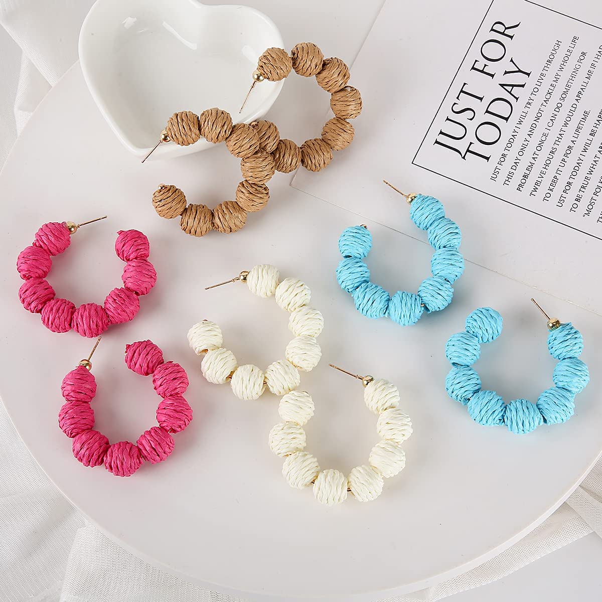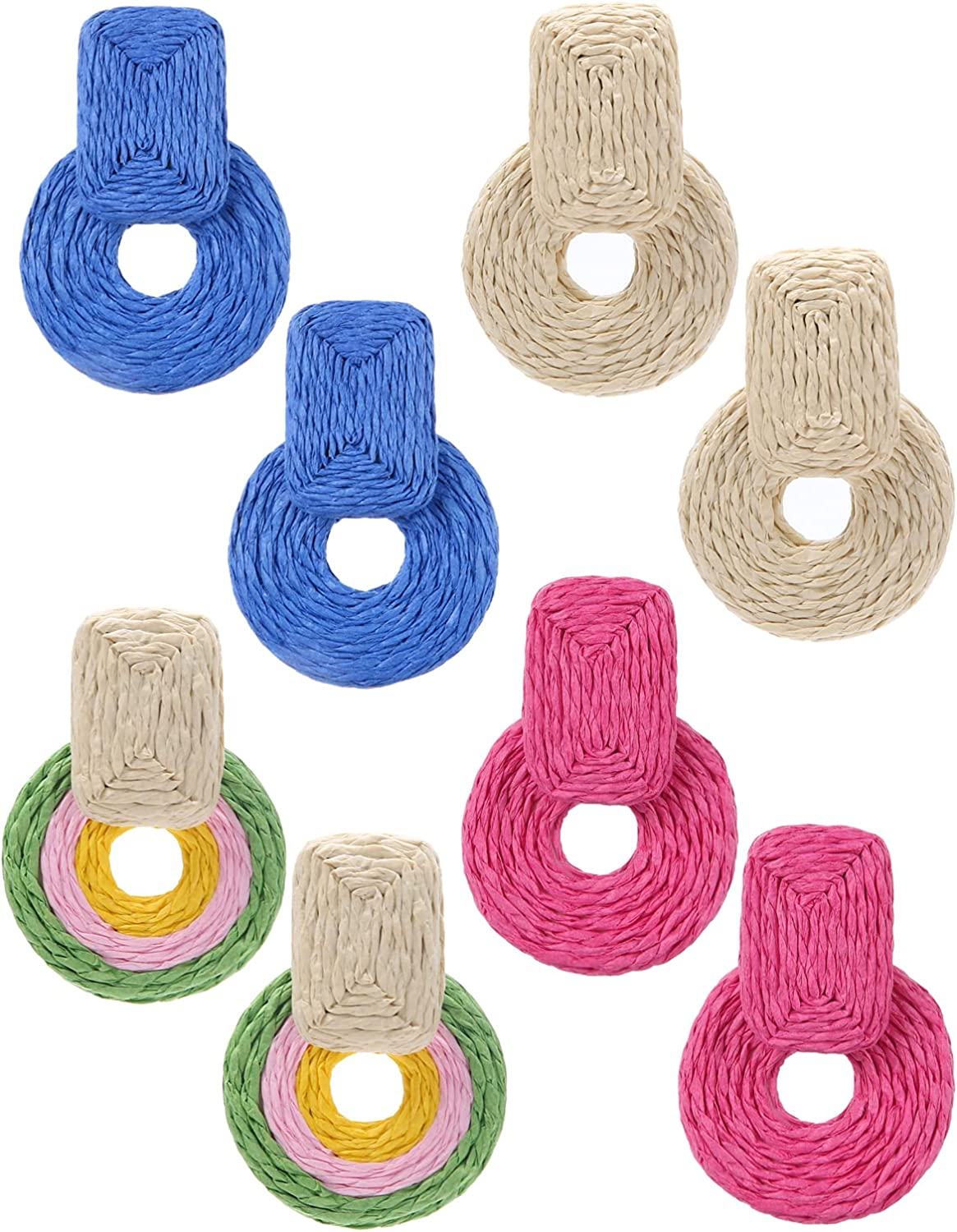 Great Vlue: earrings set of 4 pairs, including white, colorful, blue,Fushcia,very affordable,each pair is individually wrapped in a bag, and they come in a beautiful gift box.These fashion rattan earring belongs to bohemian style,suitable for daily wearing,beach,date,prom,or any occasions you want to be more charming and get more compliments.