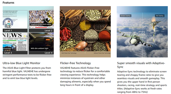 • Asus Eye Care technology features flicker-free and blue light filter technologies to minimize eye fatigue