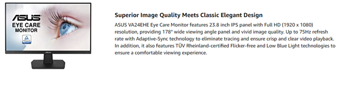 ASUS VA24EHE 23.8” Monitor 75Hz Full HD (1920x1080) IPS Eye Care HDMI D-Sub DVI-D,Black